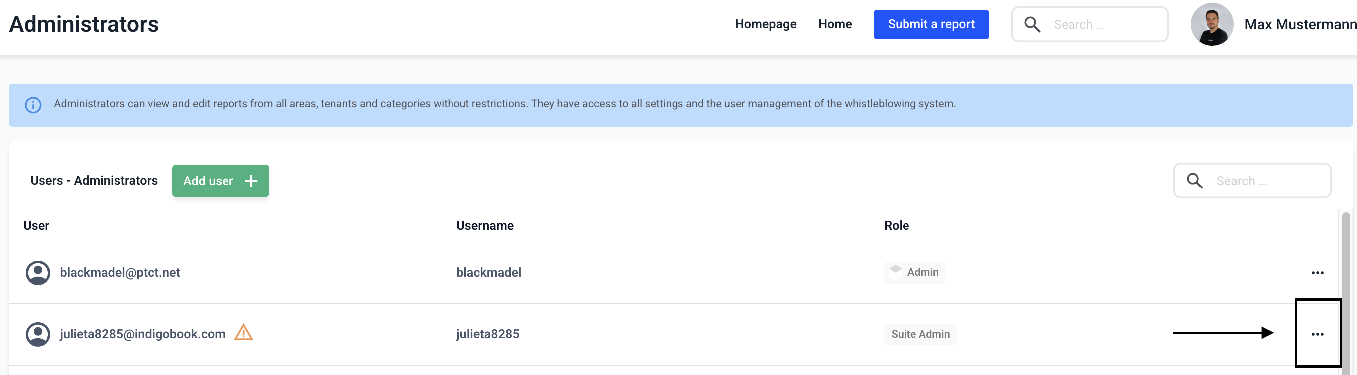 An overview of all administrators will open. To approve a user, click on the three dots on the right-hand side of the user of your choice.