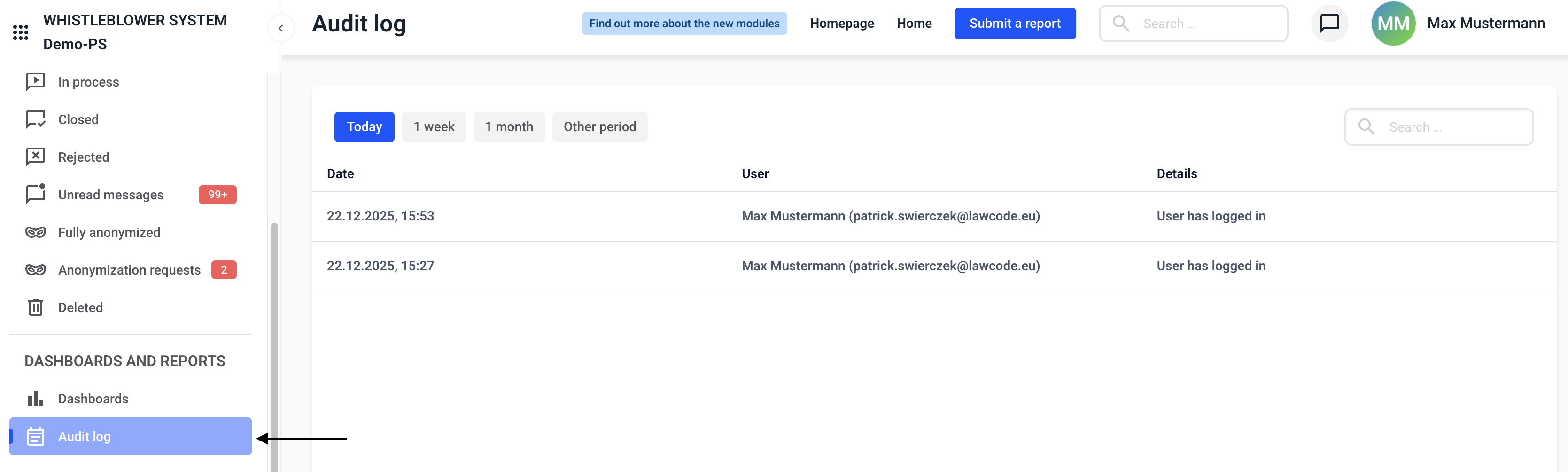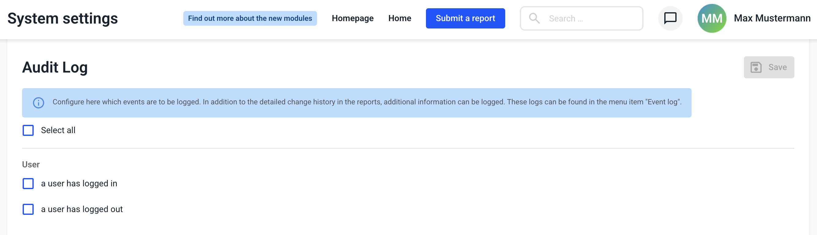 On this page you can configure which events should be logged. These logs can be found in the menu item "Audit log".