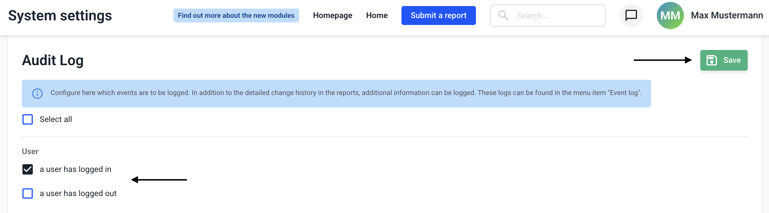 By clicking a user has logged in or a user has logged out you can also log whether a user has logged in or logged out. Activate your desired functions and confirm by clicking Save.