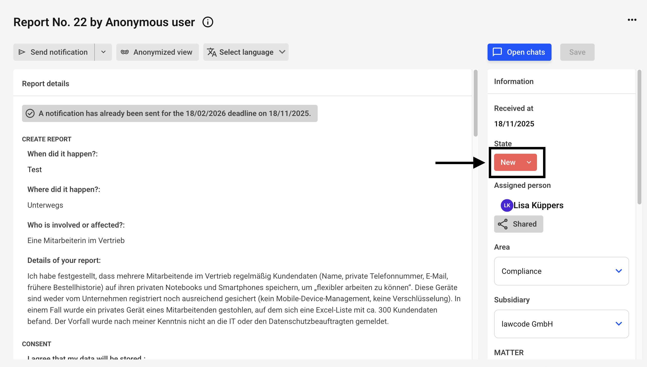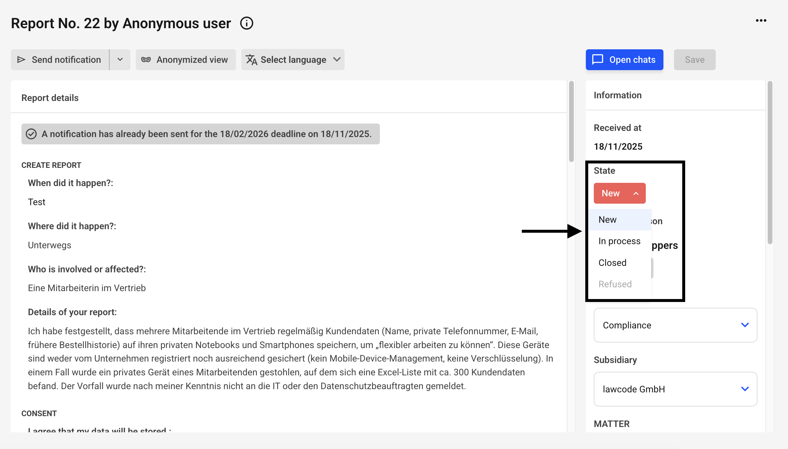 Then you can choose between the statuses "New", "In progress", "Closed".