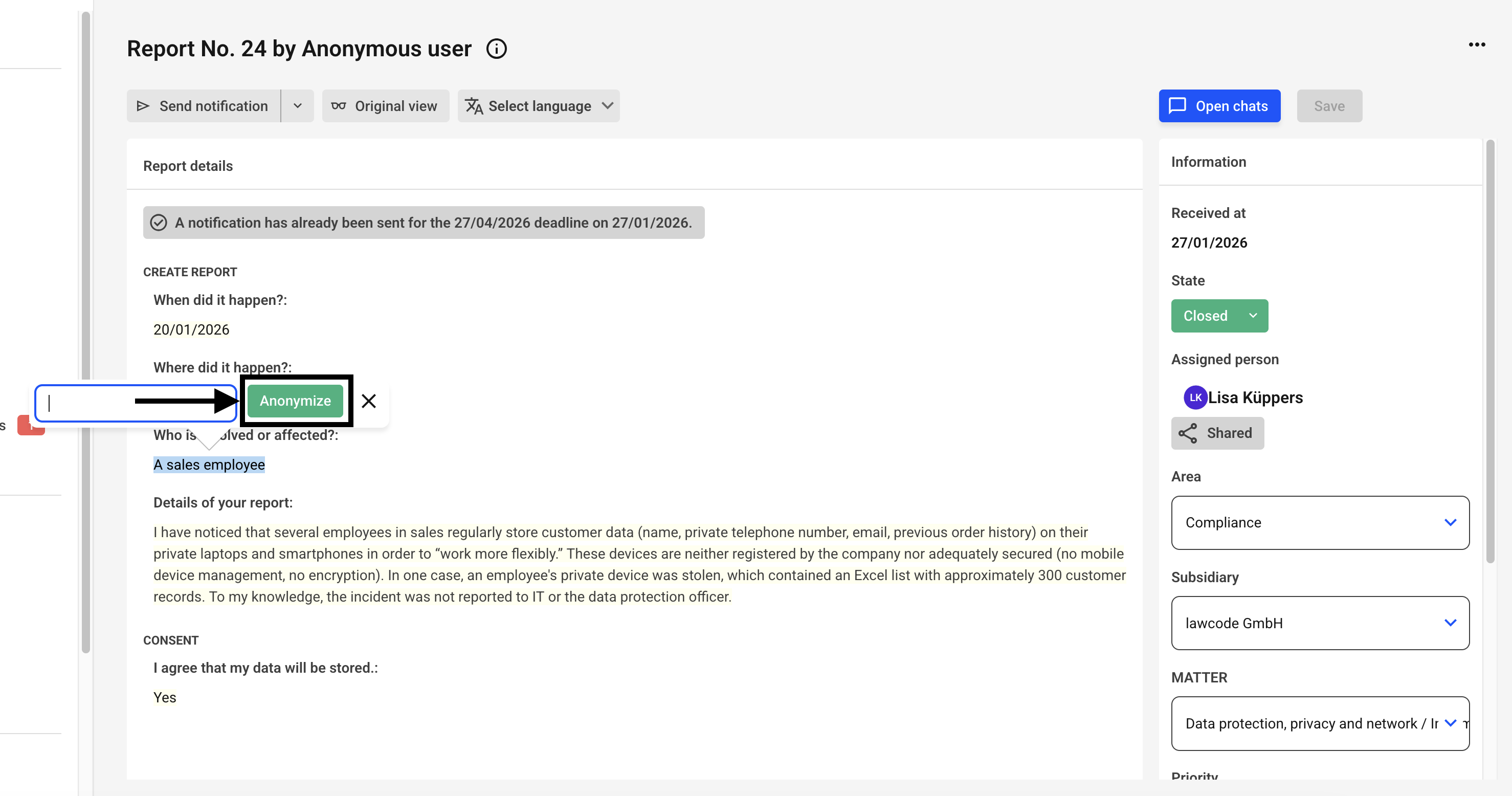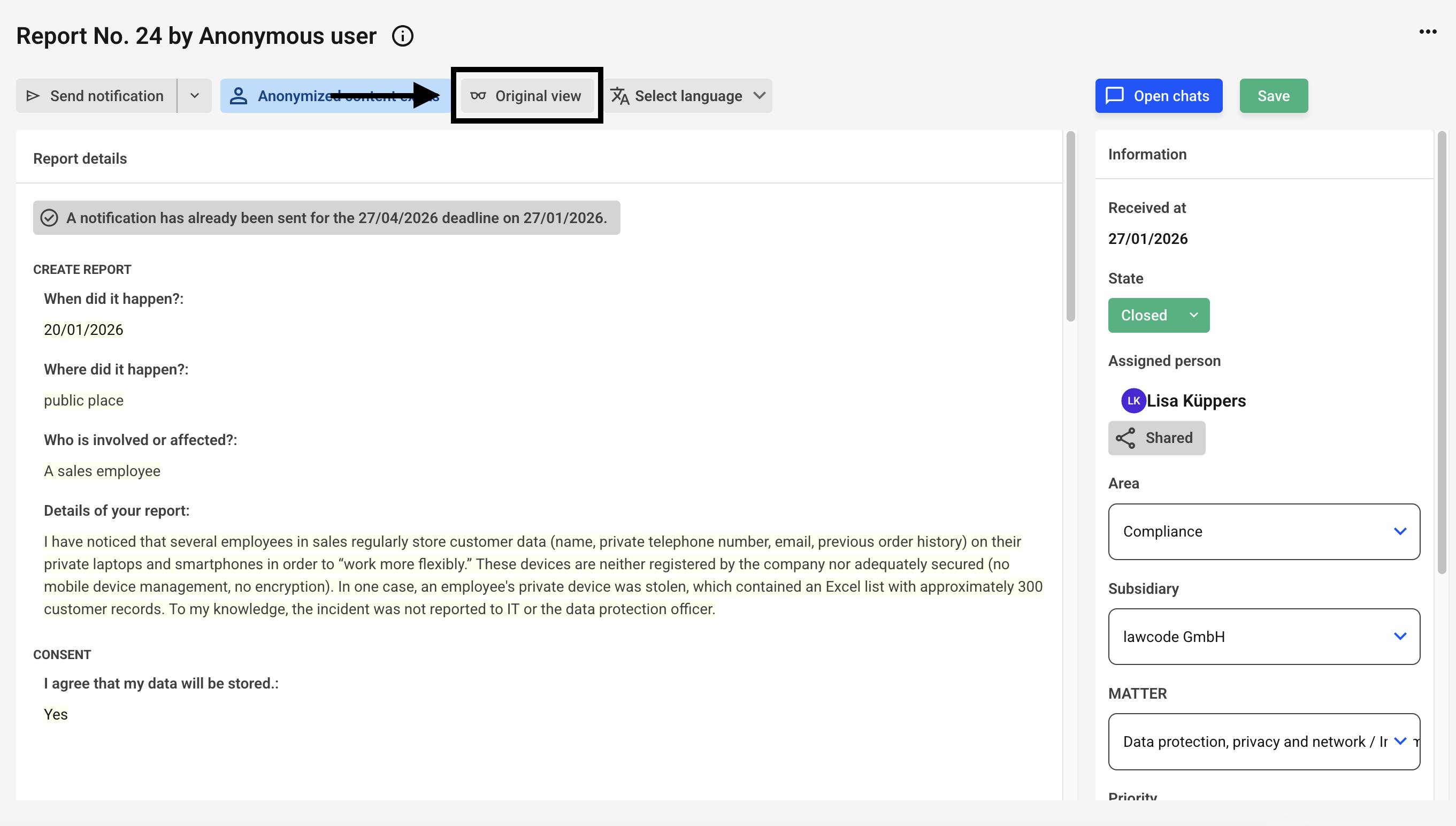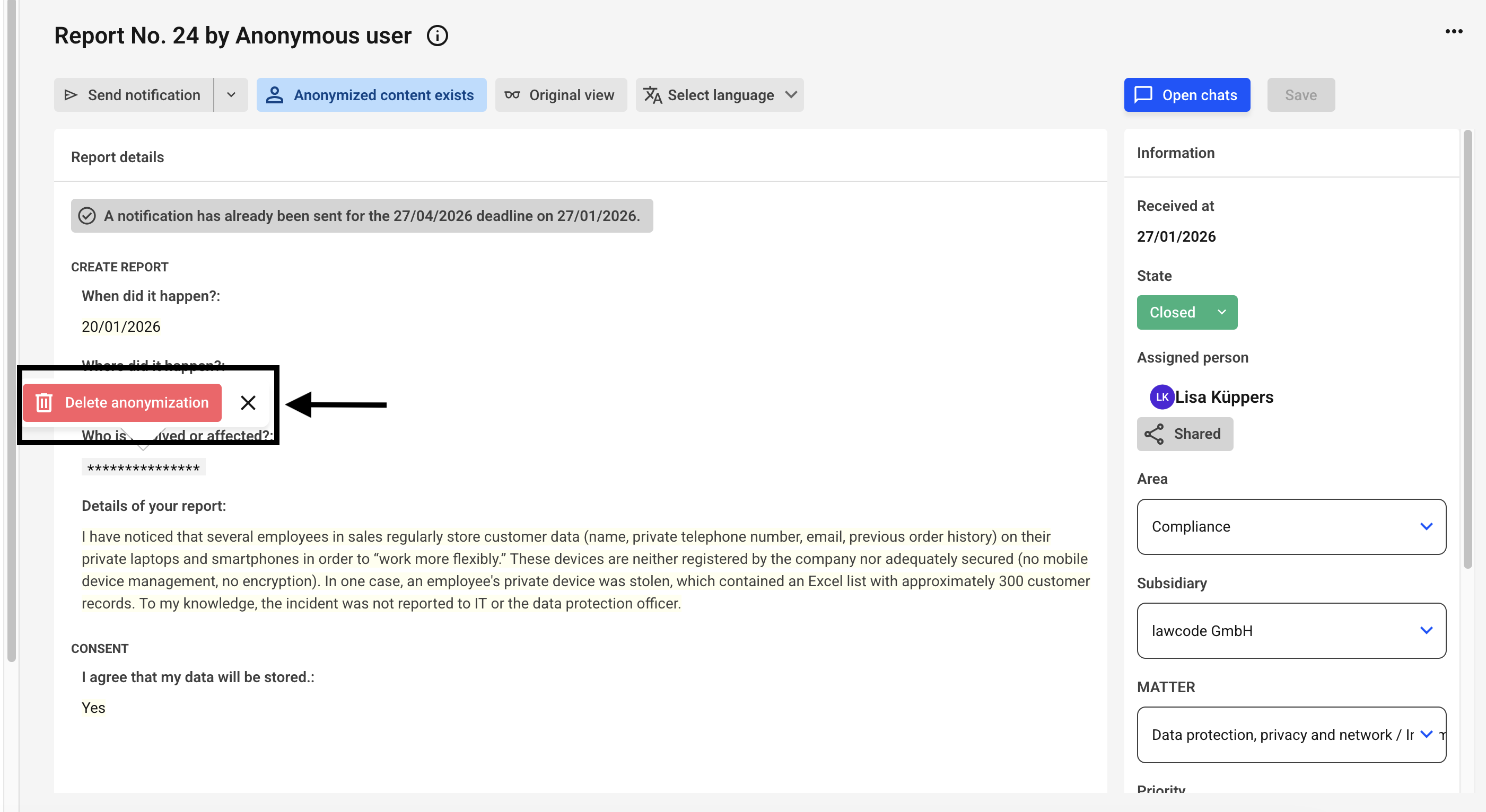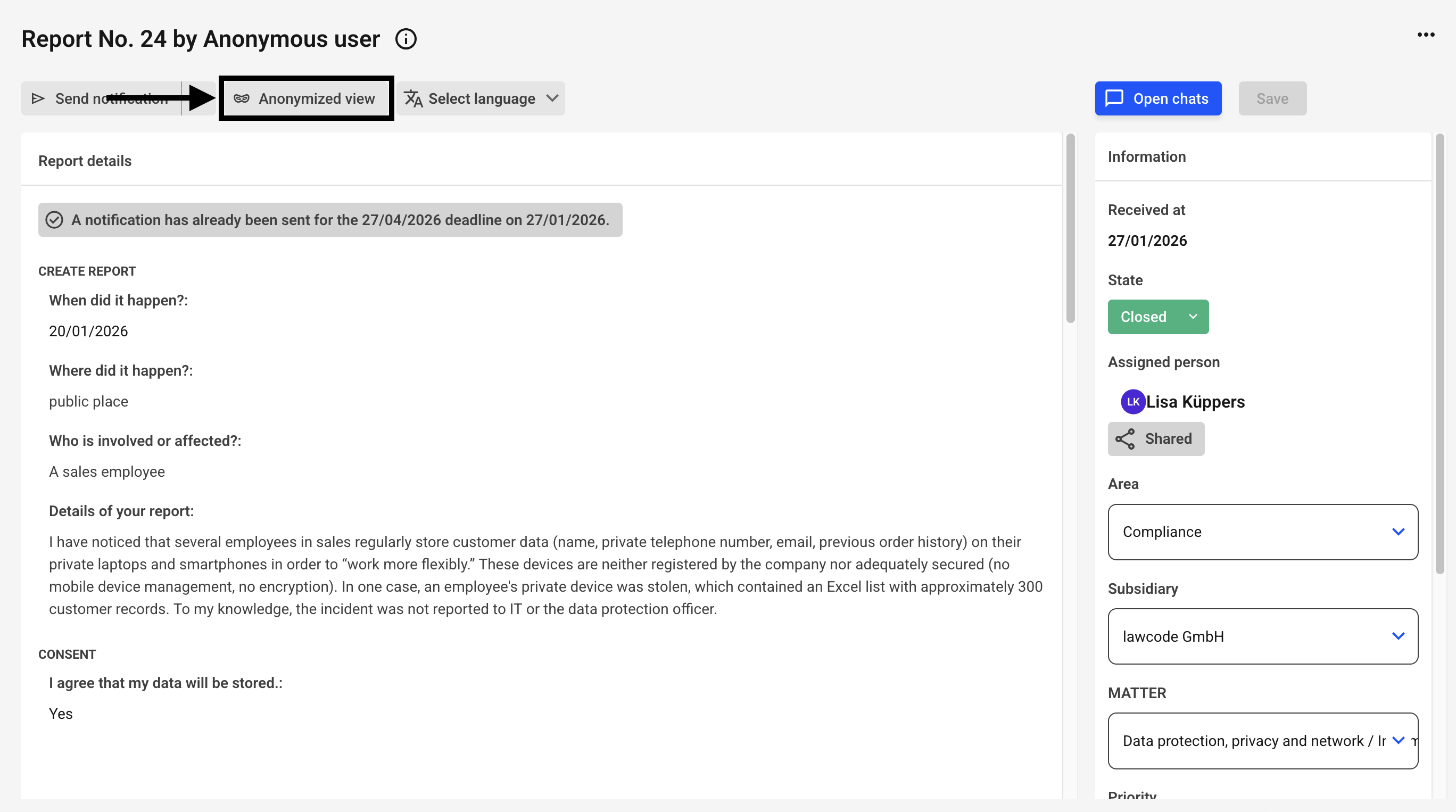 By clicking on the highlighted symbol, you can switch to the anonymized view and anonymize the contents of the report.