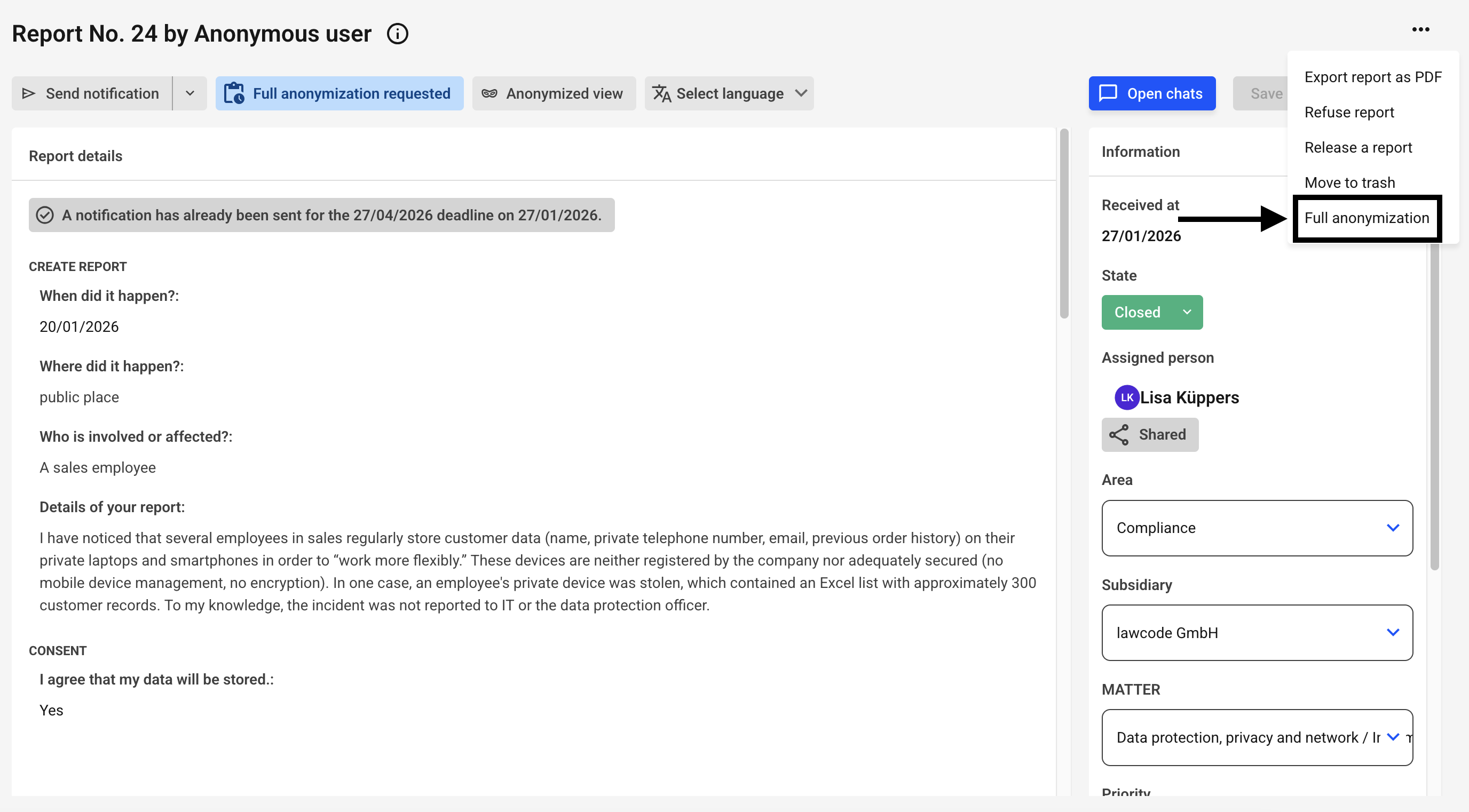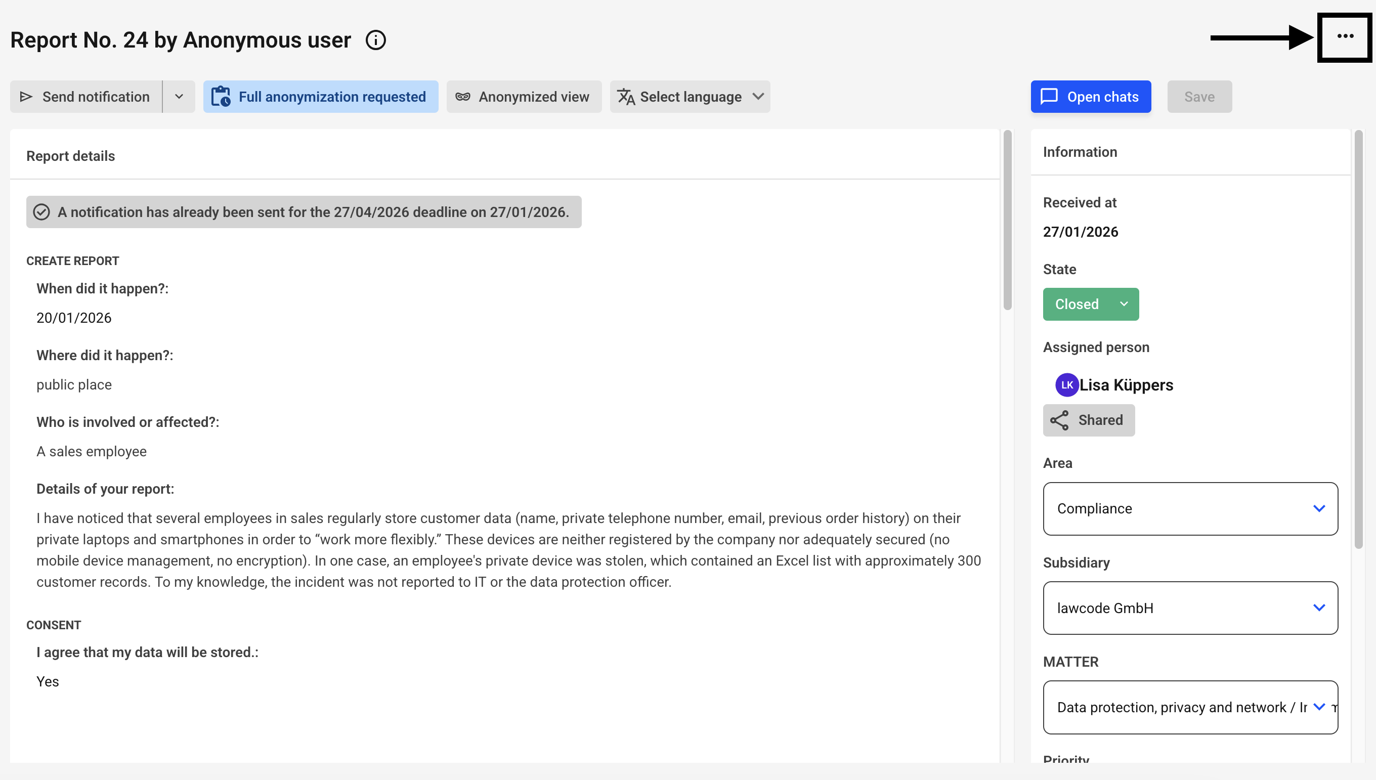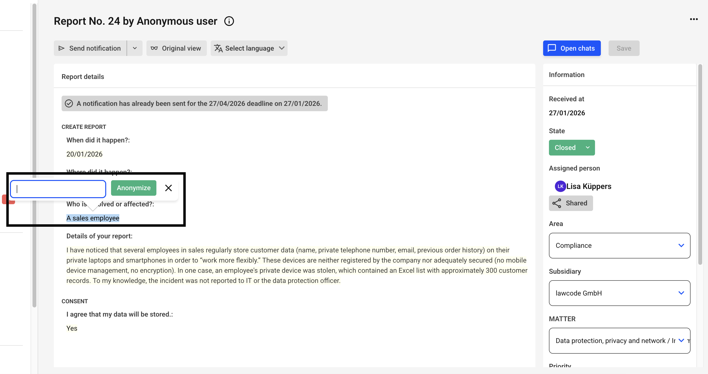 By clicking on the highlighted symbol, you can switch to the anonymized view and anonymize the contents of the report.