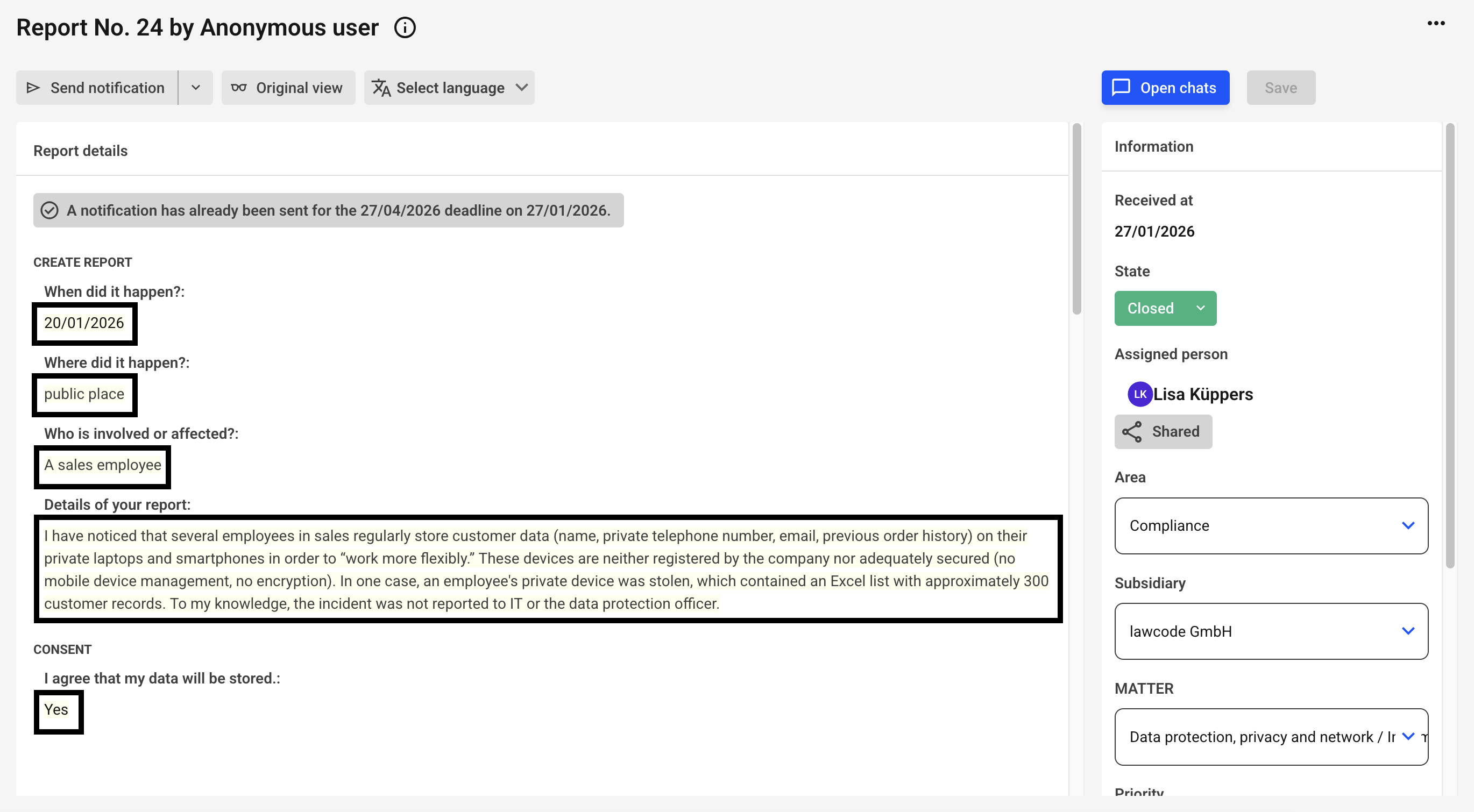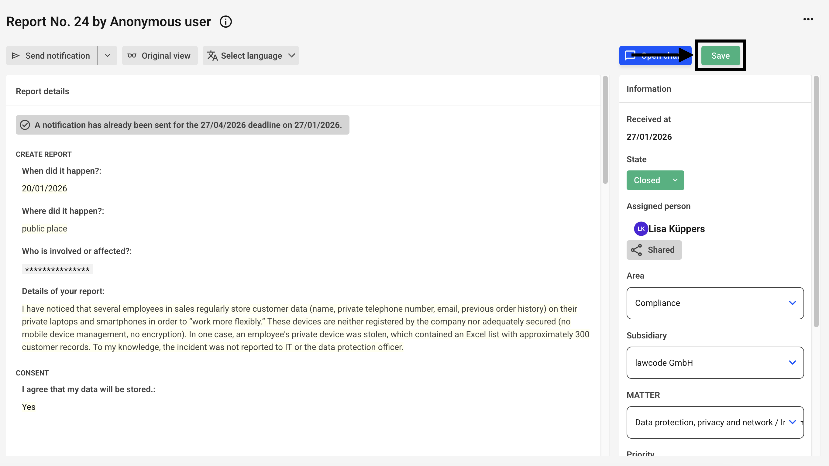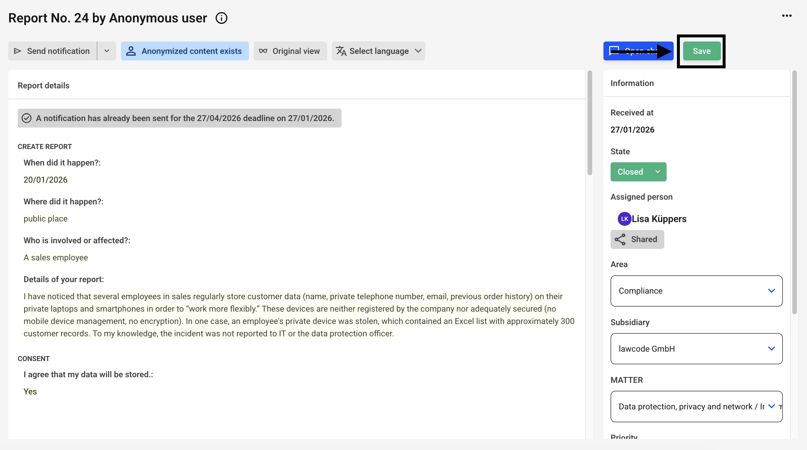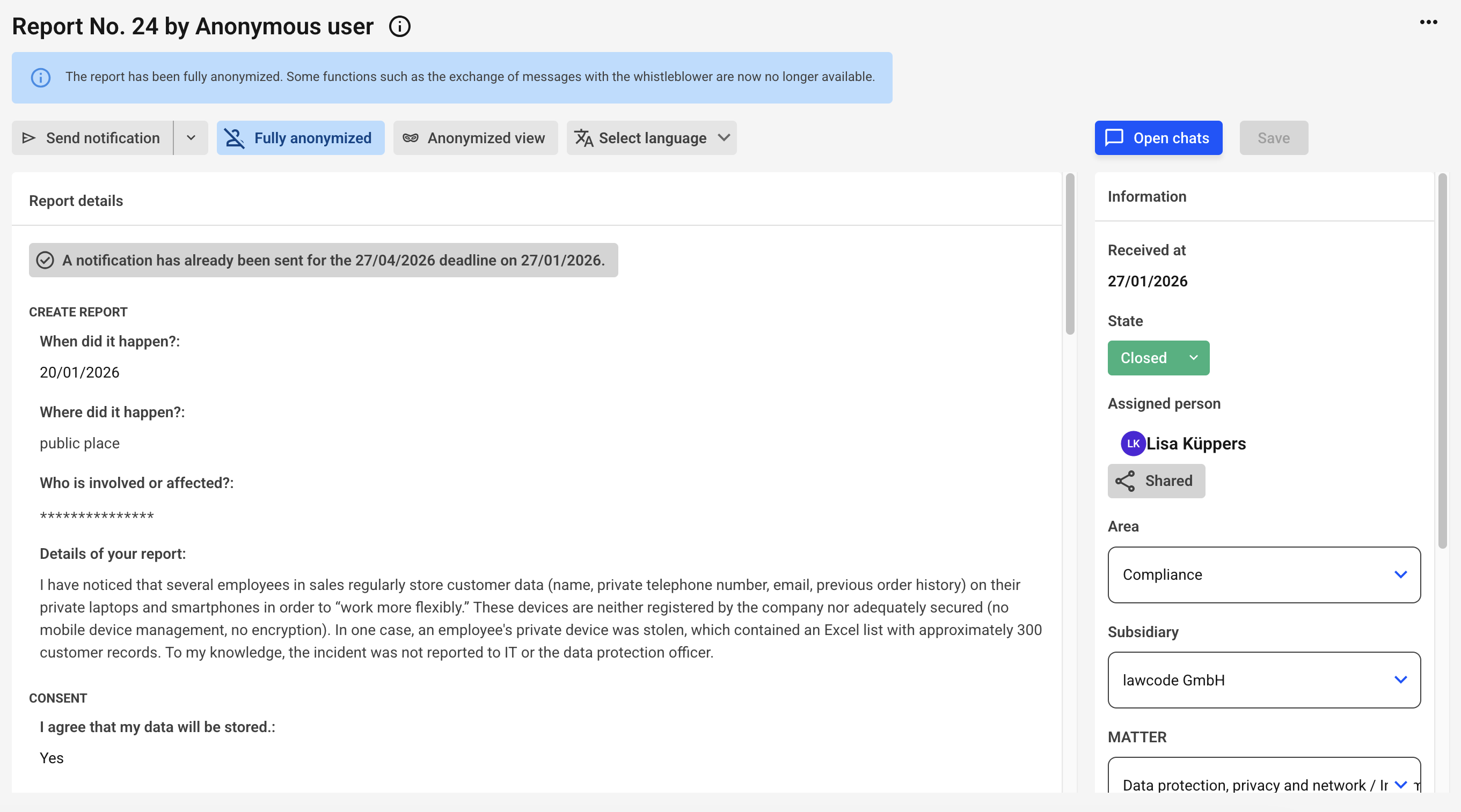 By clicking on the highlighted symbol, you can switch to the anonymized view and anonymize the contents of the report.