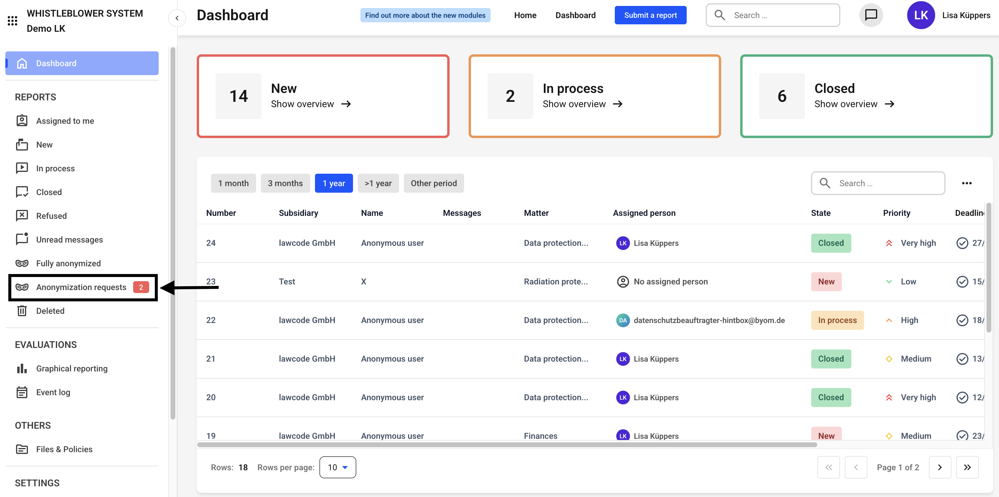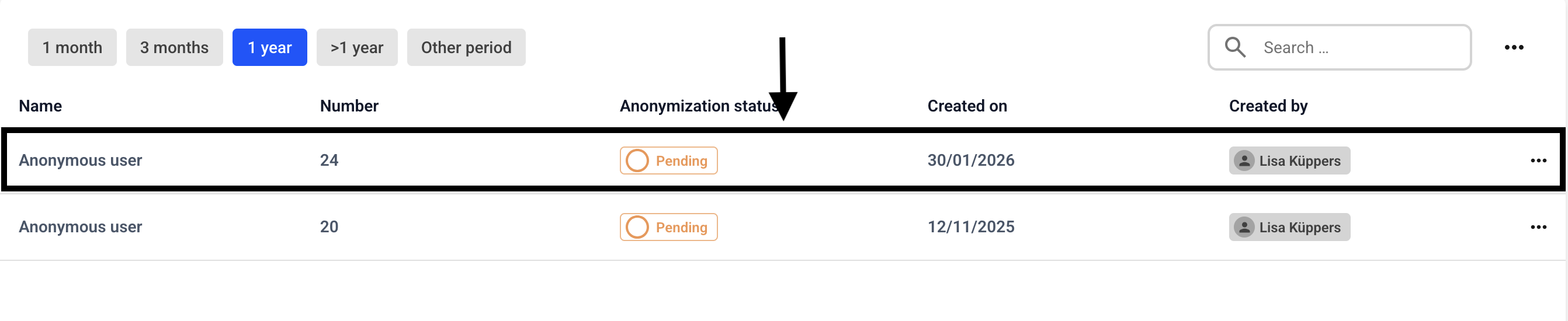 Another admin must approve the request. (Another administrator is now logged in here). Click on Request anonymization in the dashboard.