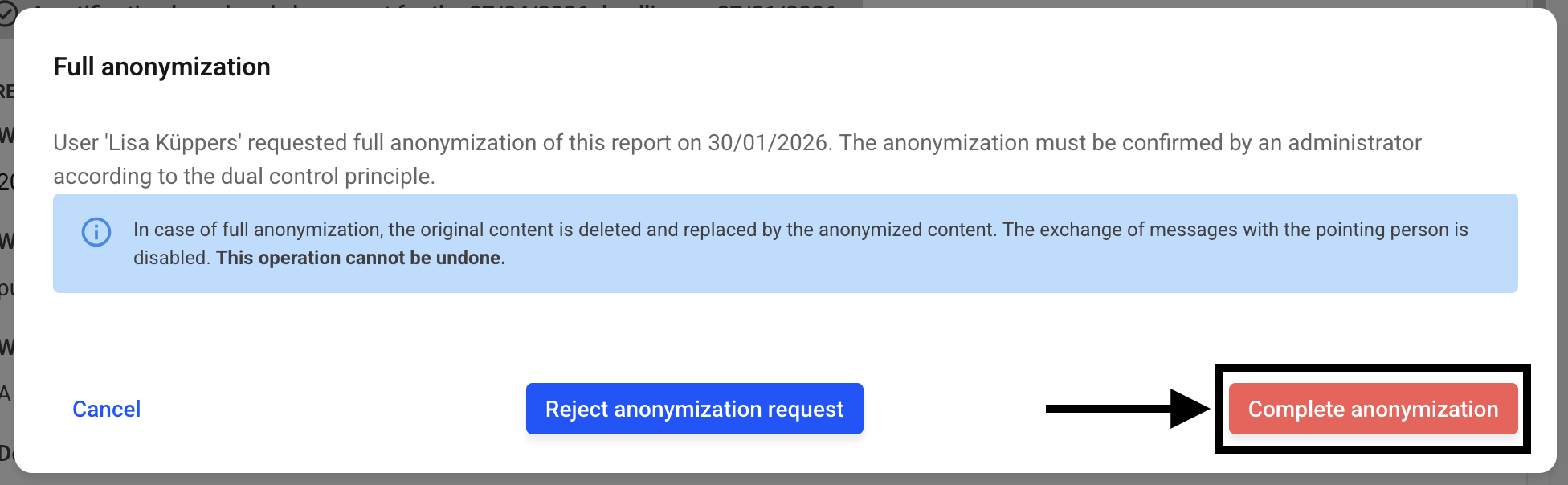 You can withdraw or complete the request for anonymization. In this case, click on Accept anonymization.