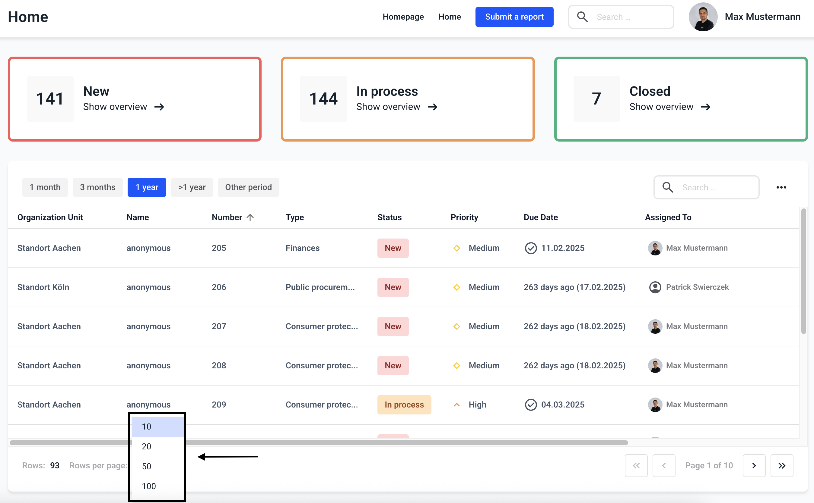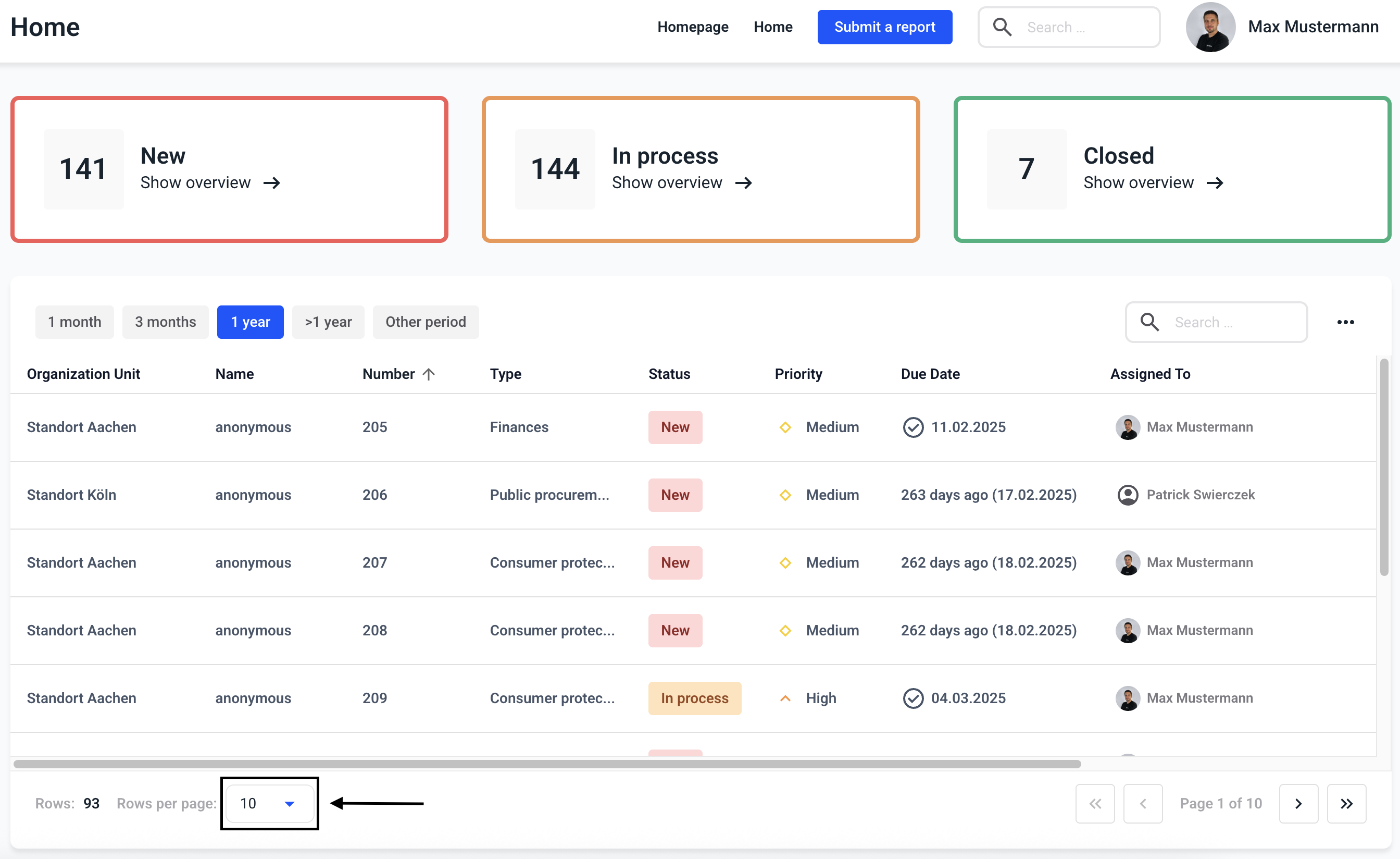 To change the number of rows displayed, click on the drop-down menu at the bottom of the dashboard, under Rows per page.