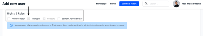 By clicking on the respective checkbox on the roles, you can add a role. For readers and managers, the following three fields must be selected.