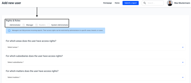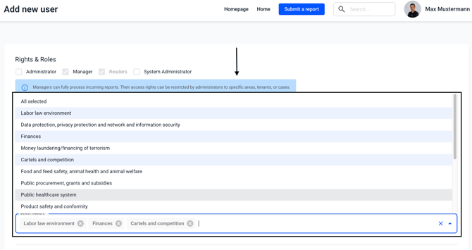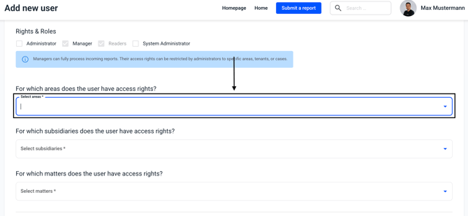 Access rights area - for the roles of reader and manager it is possible to select the areas to whose reports the user should have access.