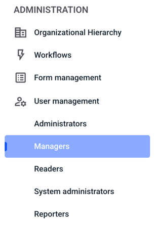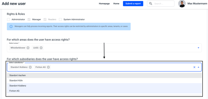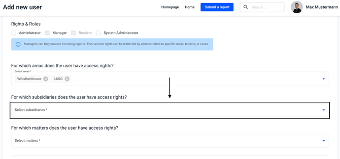Subsidiary access rights - In the case of the Reader and Manager roles, it is possible to select the subsidiaries to whose reports the user should have access.