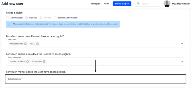 By clicking in the Select matters field you can select the matters to which the user should have access.