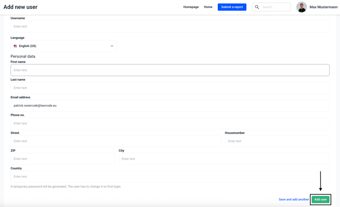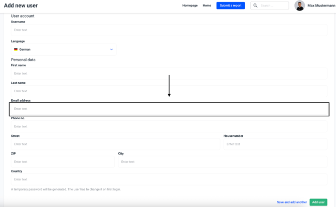 User name - The user name can either be assigned or is automatically generated from the e-mail address after the user is created.