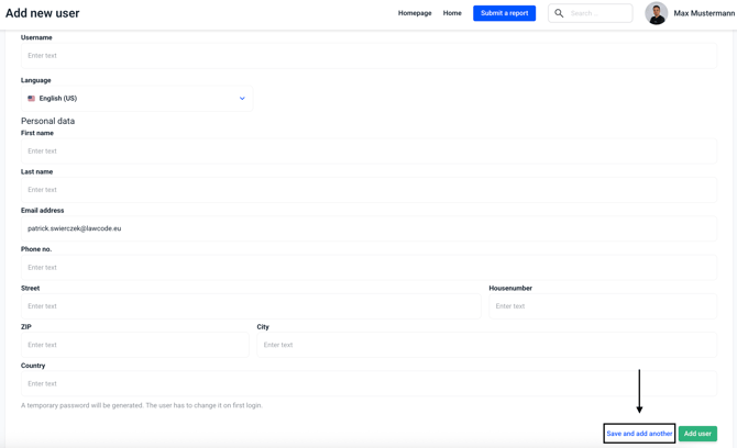 Language - setting the language profile ensures that the invitation e-mail to the system is sent in the selected language on the one hand, and that the hintbox for the user is displayed in this language on the other hand.