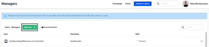 You will first see an overview of all users who have the role of manager. Now click on Add user to create another manager.