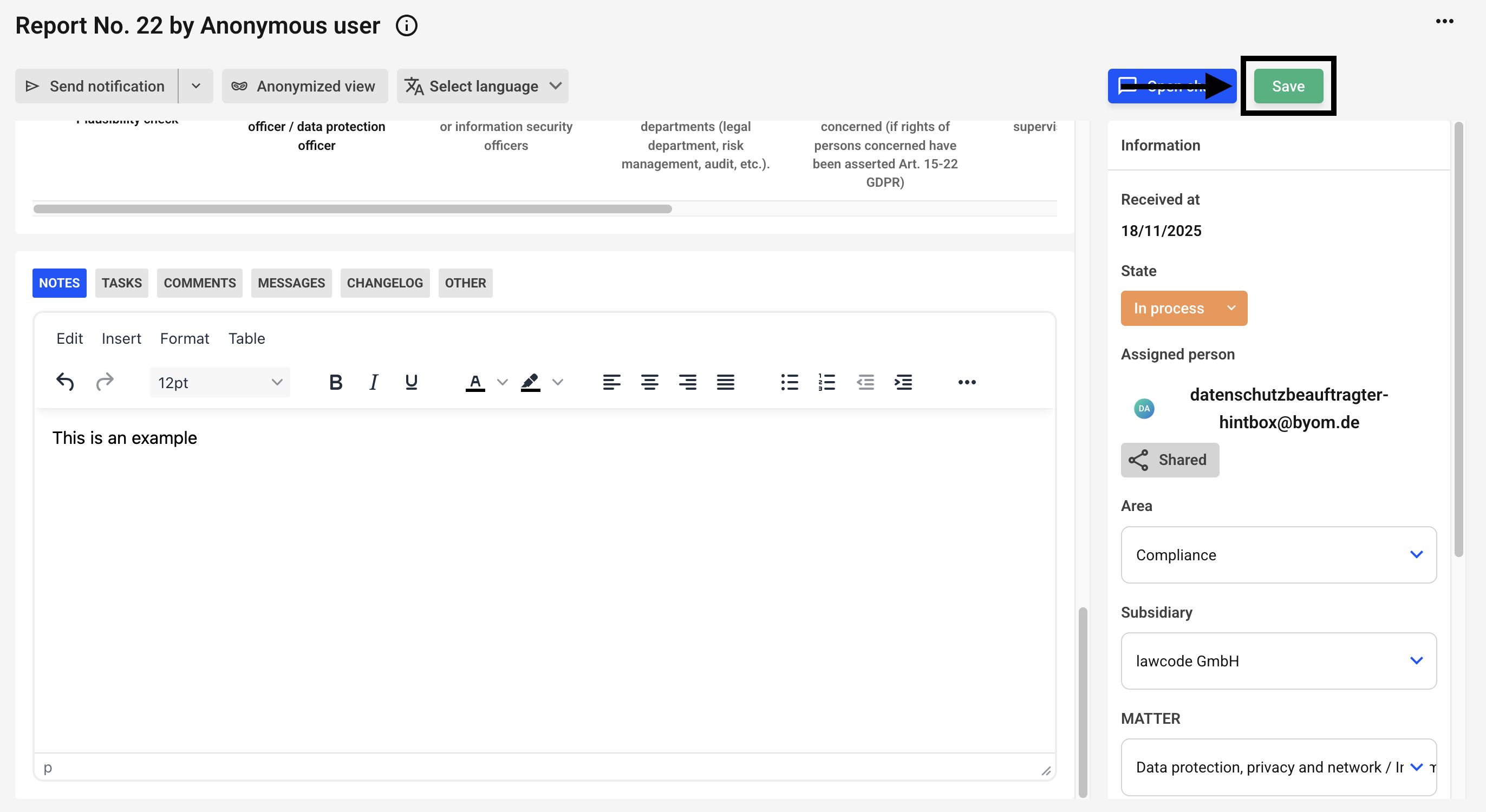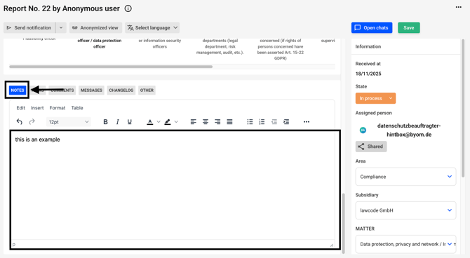 Notes can be recorded for an SAP Note. To do this, click on "Notes" in the Note detail view and you should then be able to use the text editor to record your notes.