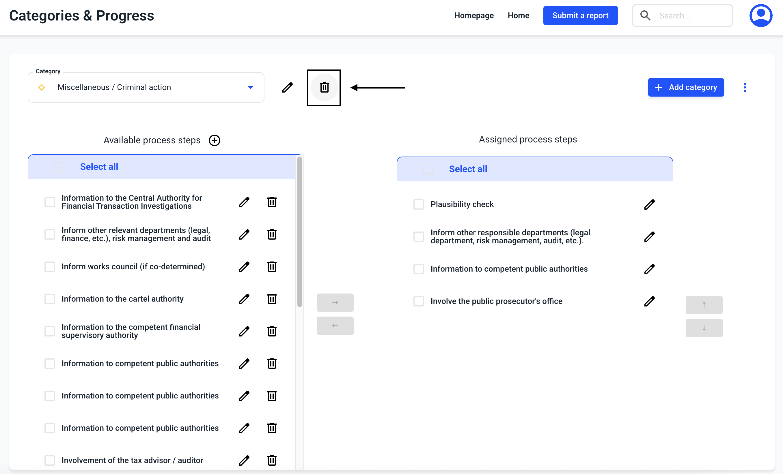 Clicking on the recycle bin deletes the category. A deleted category cannot be restored!