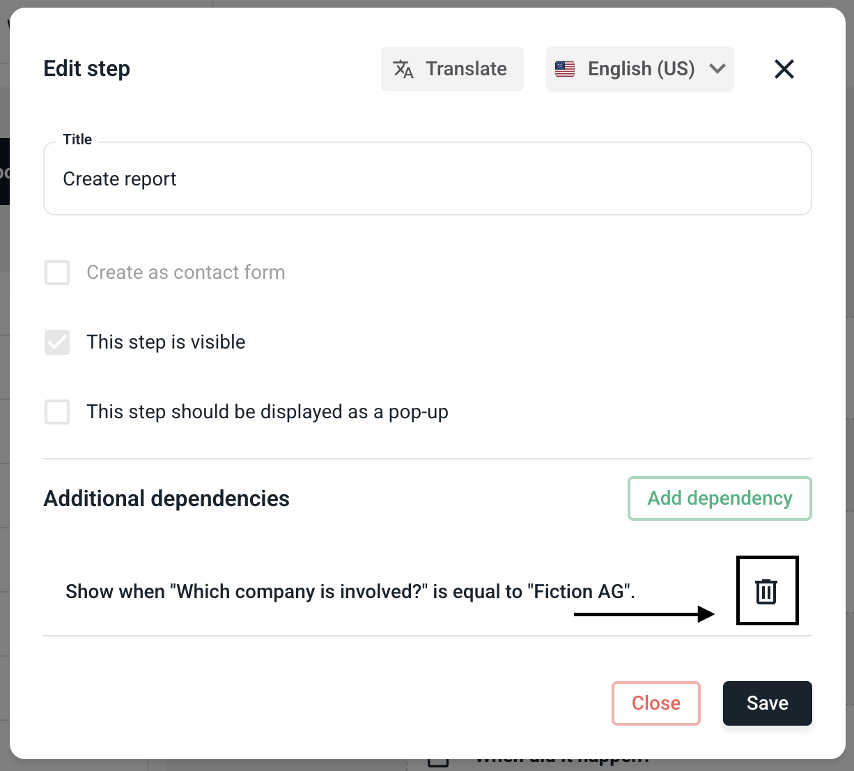 In this chapter we will explain how to delete a dependency from a step.