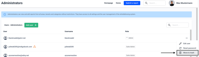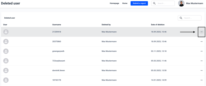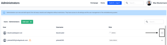 An overview of all administrators in the system will open. Now click on the three dots on the right-hand side of the user you want to delete.