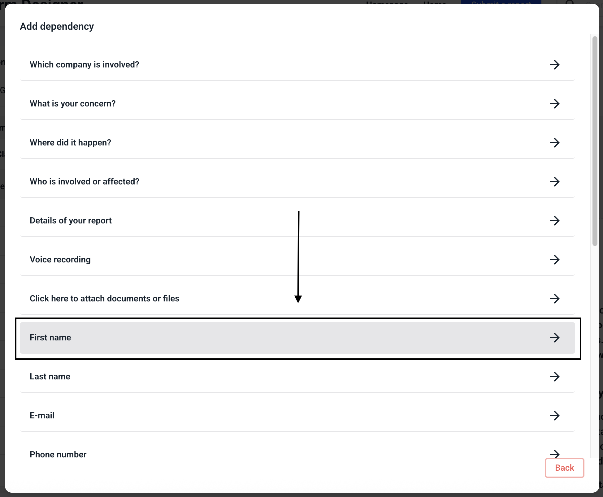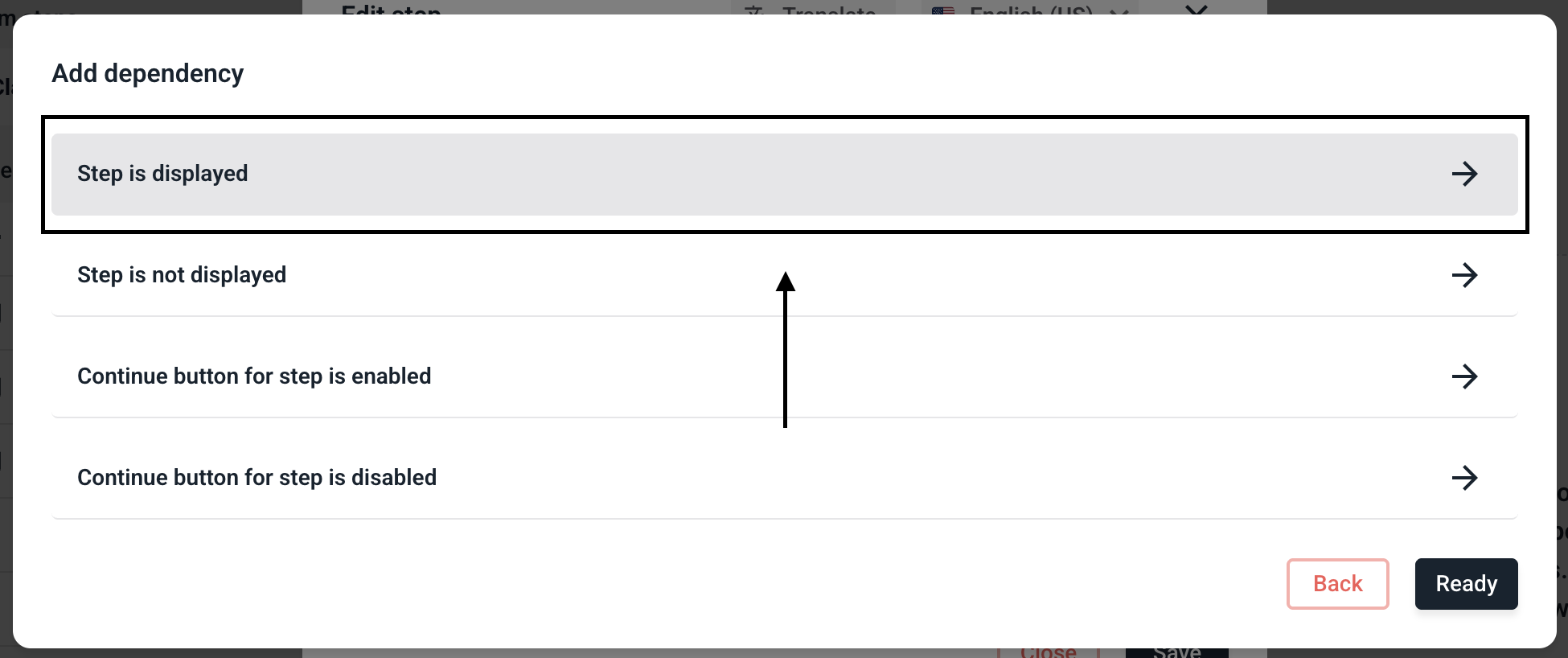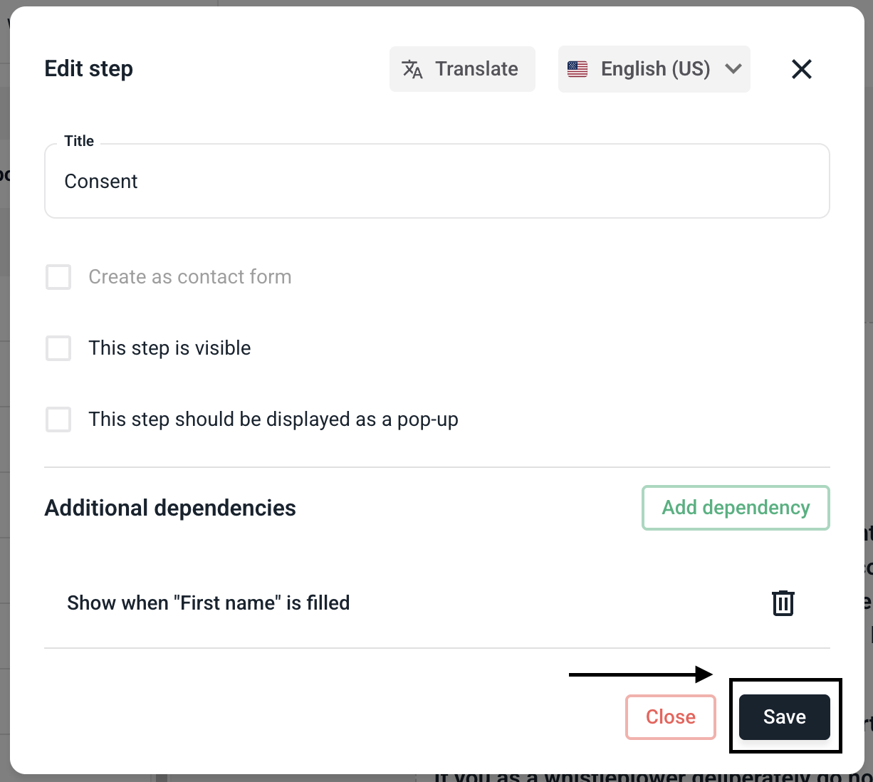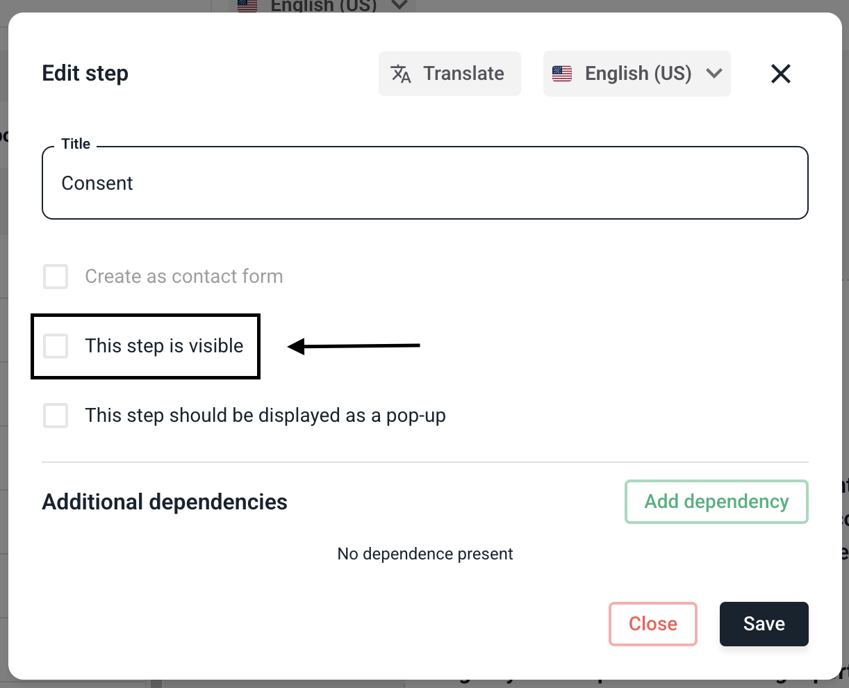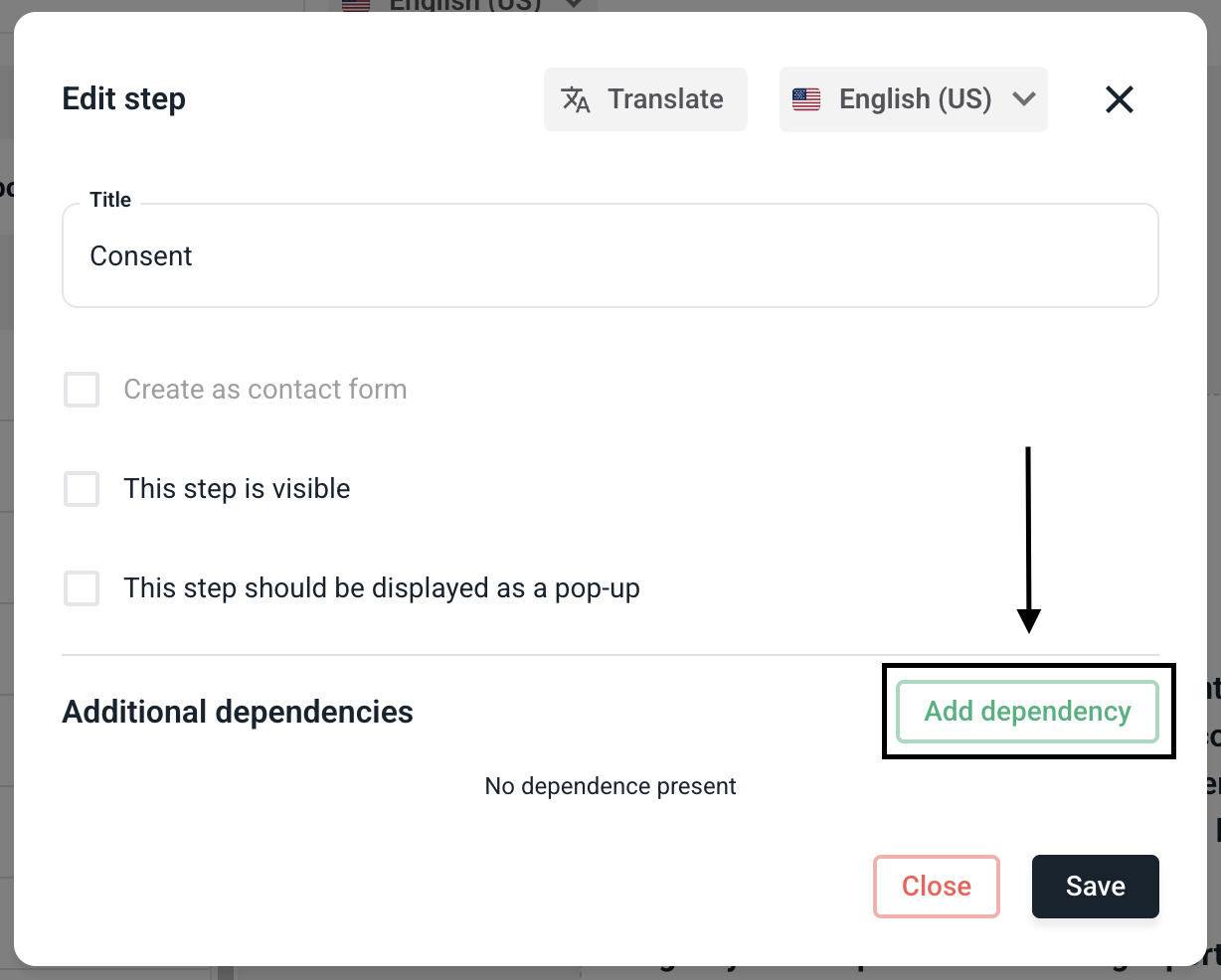 To make the step visible for certain fields, click on Add dependency.