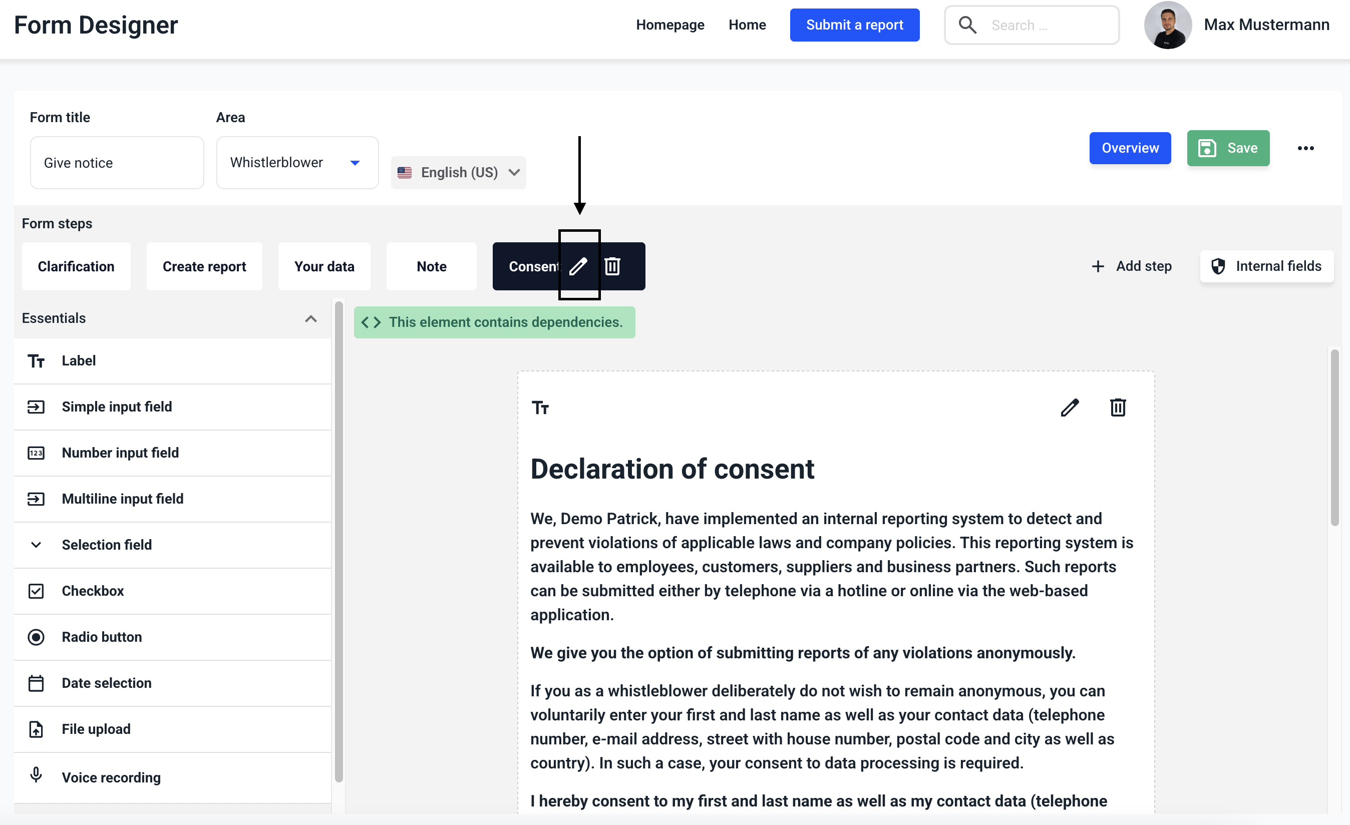 In this example, the declaration of consent appears as soon as the whistleblower enters anything in the First name field. You can repeat this for all desired fields from the contact form (e.g. last name, e-mail address, ...). Then click on Save.