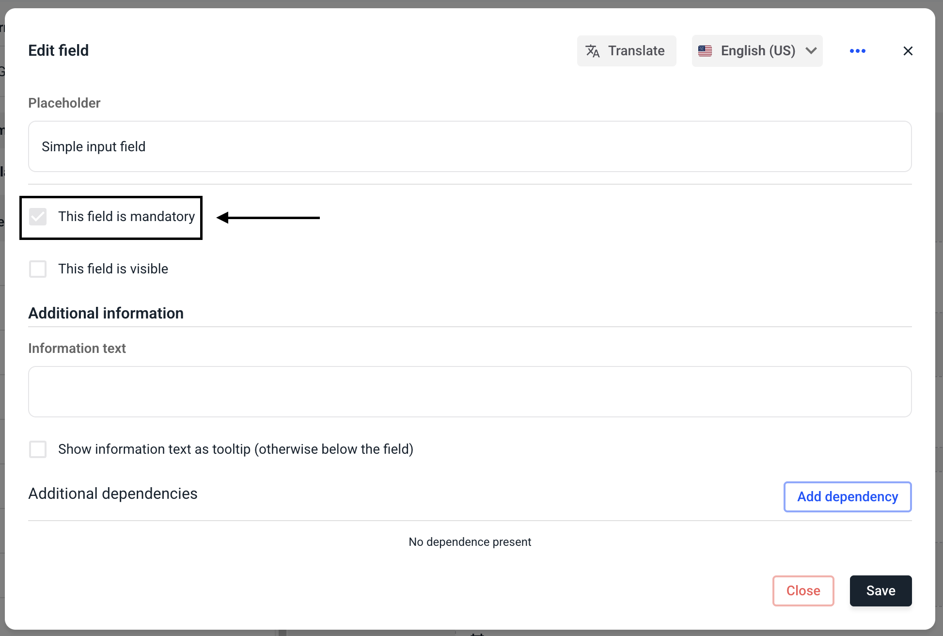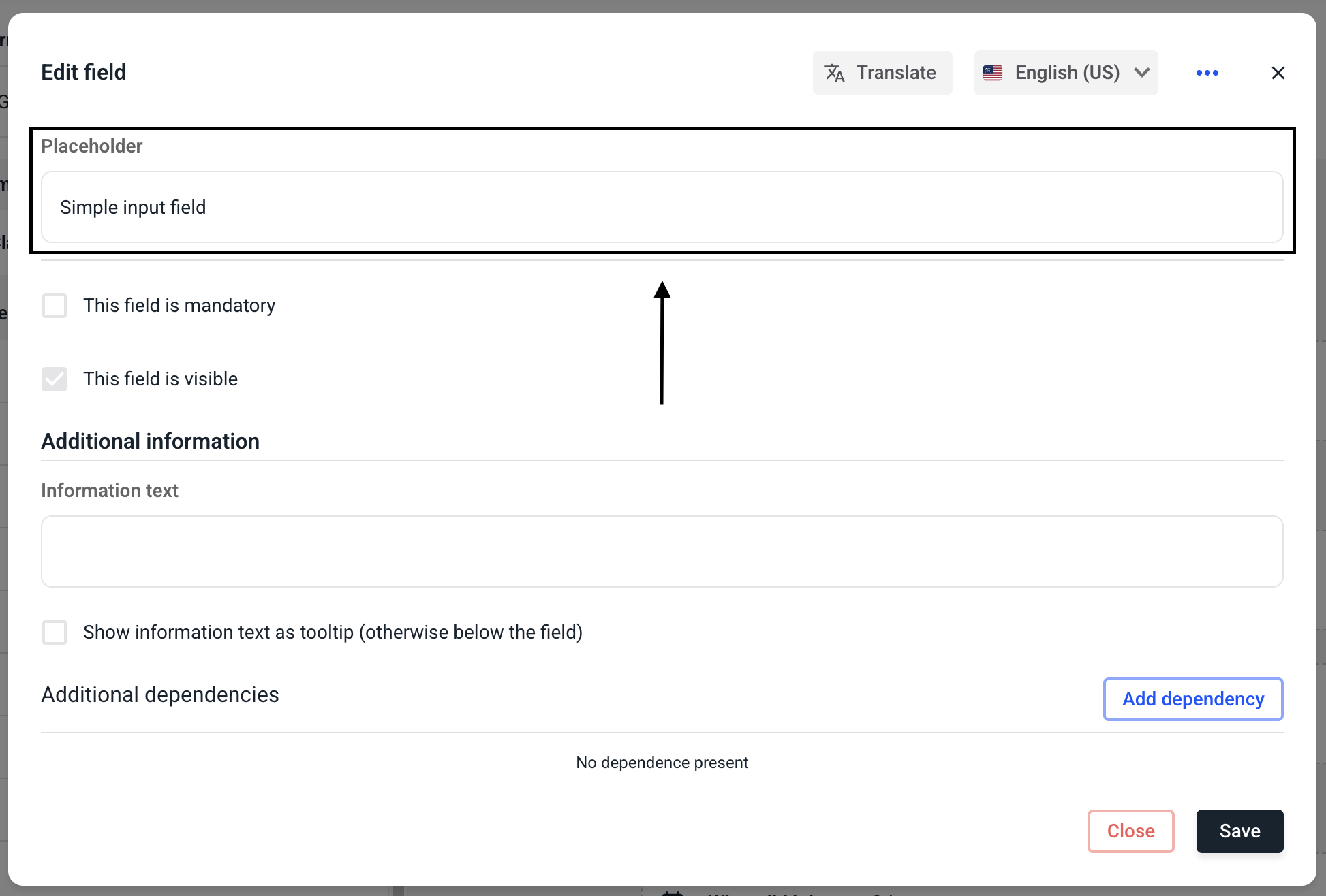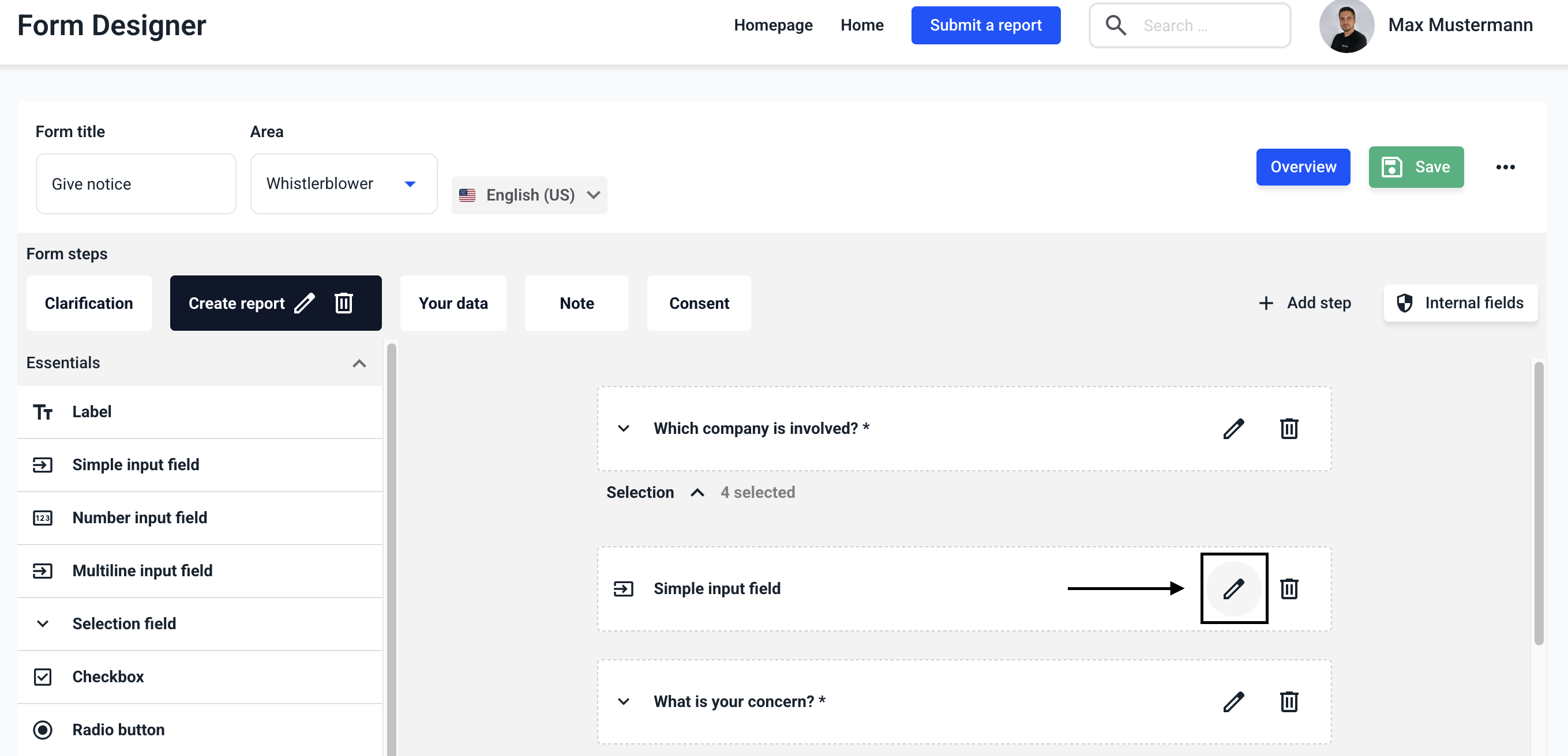 There are various ways to edit a field: Name the field (Placeholder), make the field mandatory, make the field visible, add information text and add dependencys.