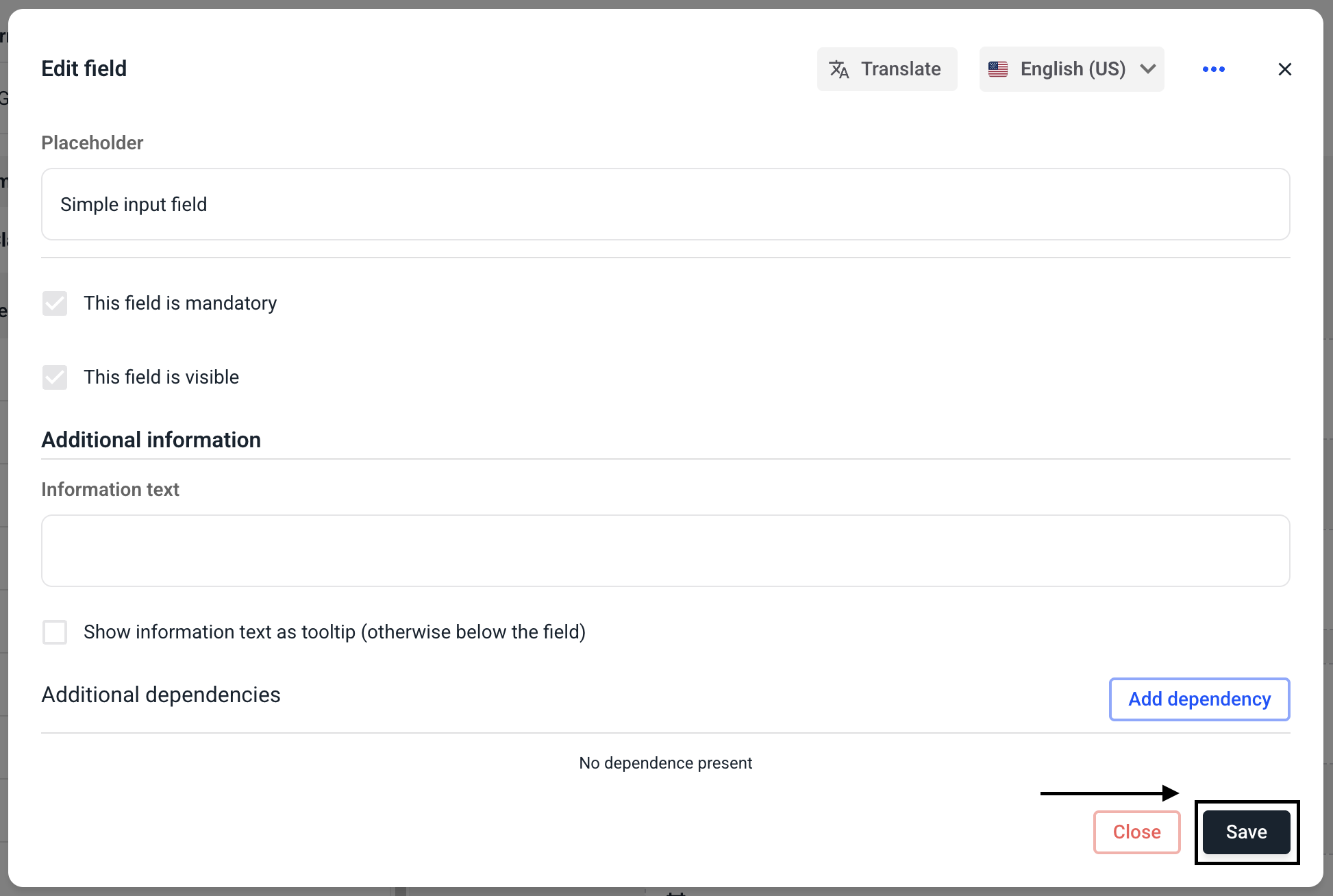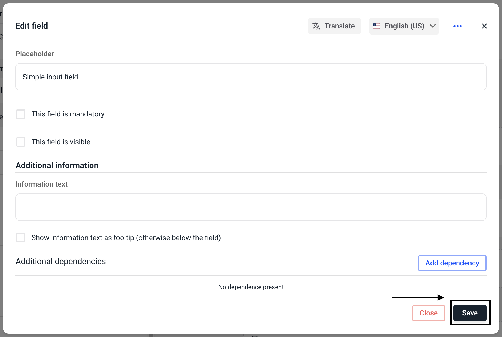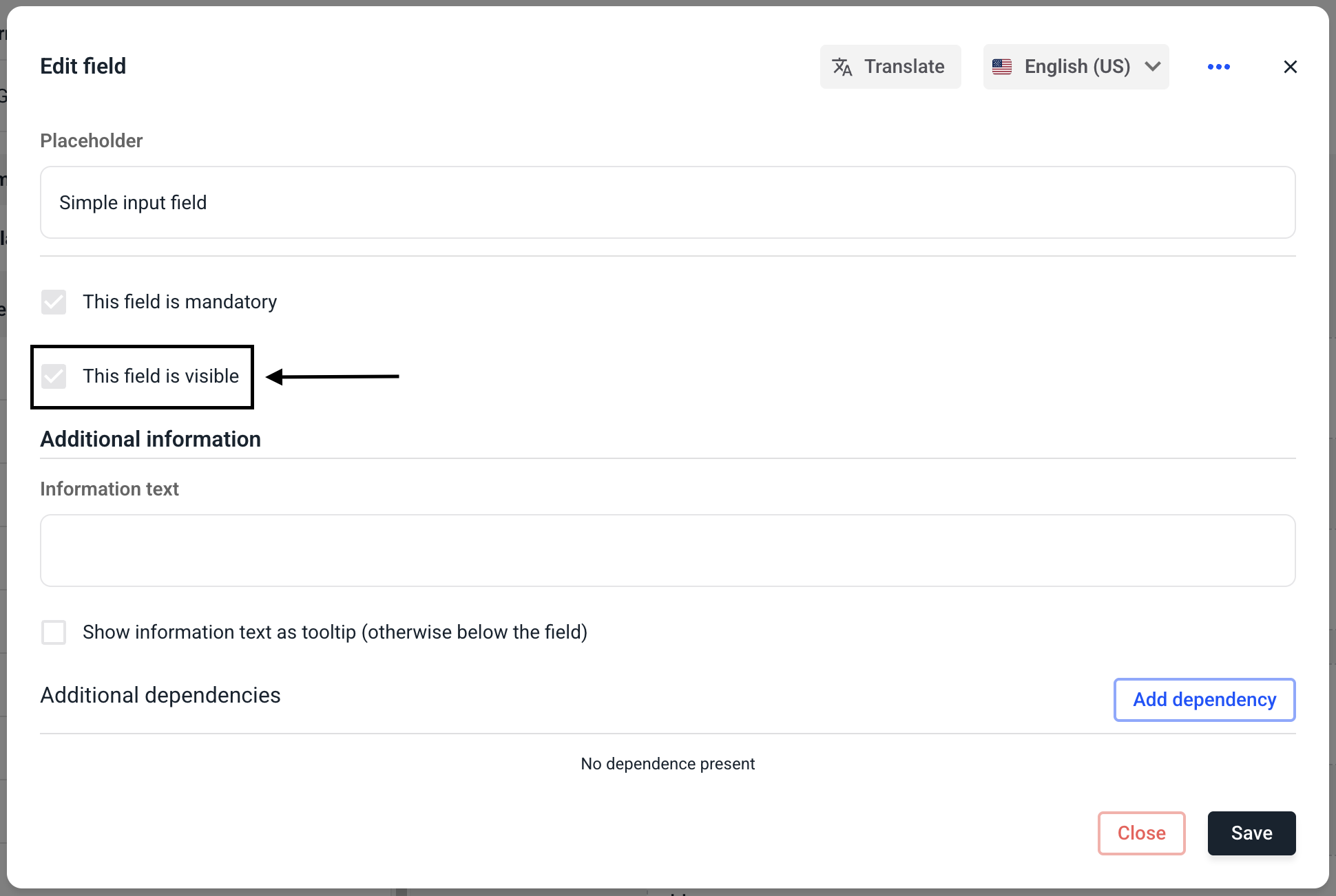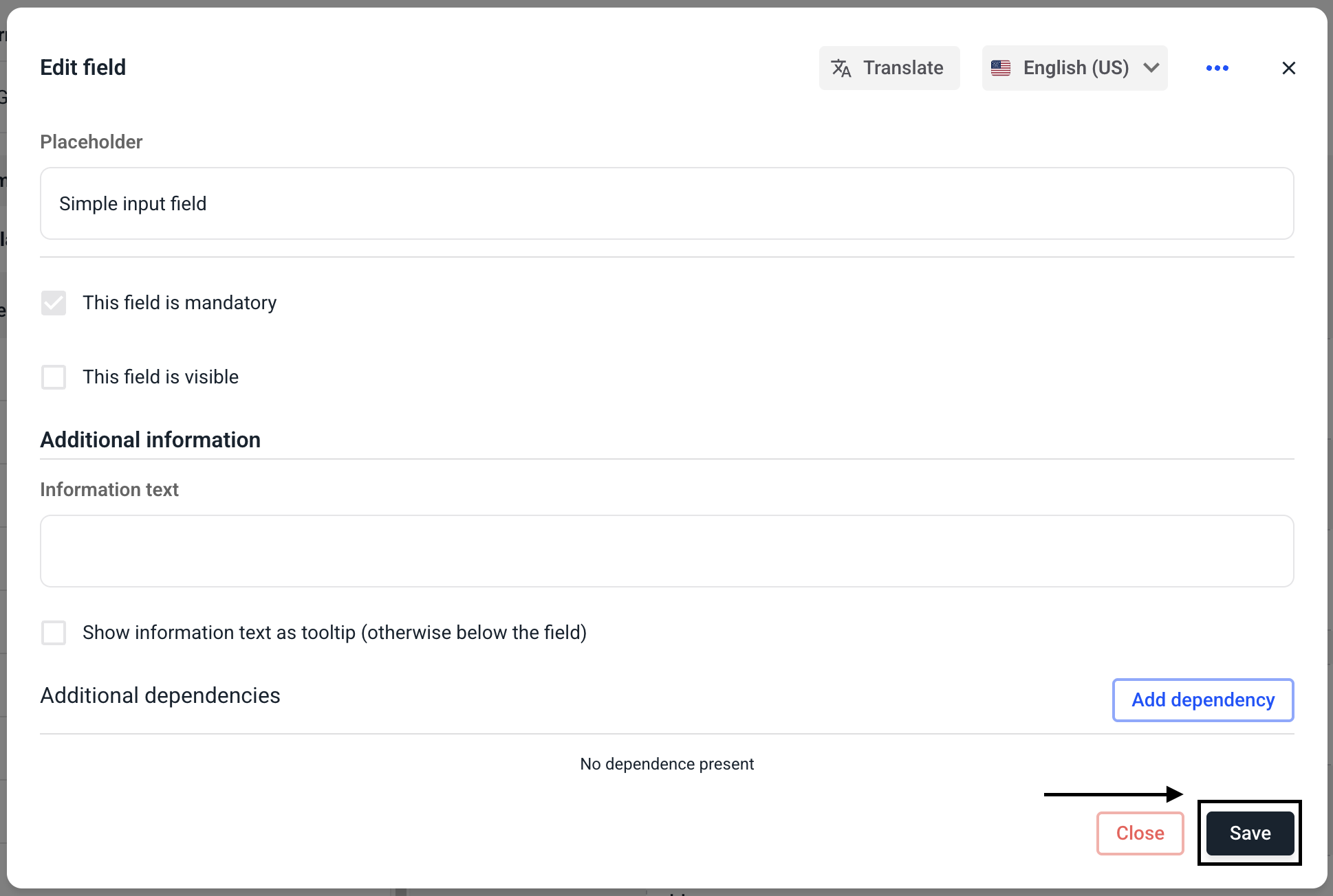 There are various ways to edit a field: Name the field (Placeholder), make the field mandatory, make the field visible, add information text and add dependencys.