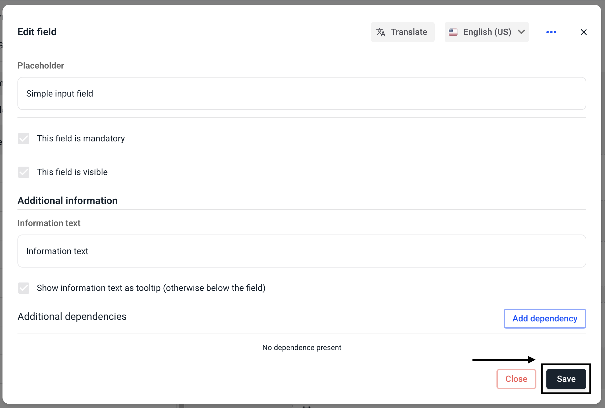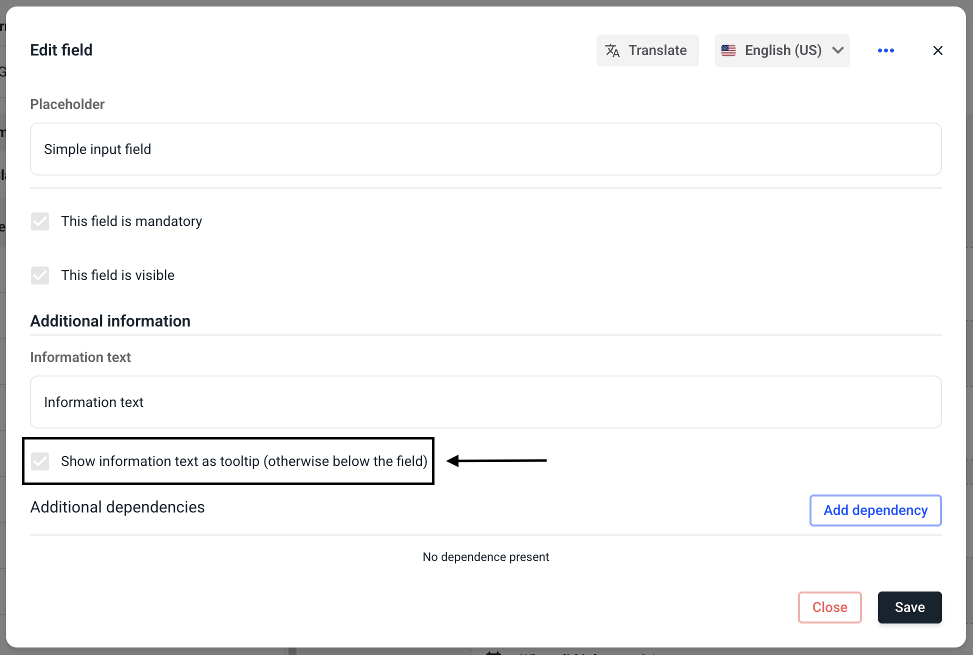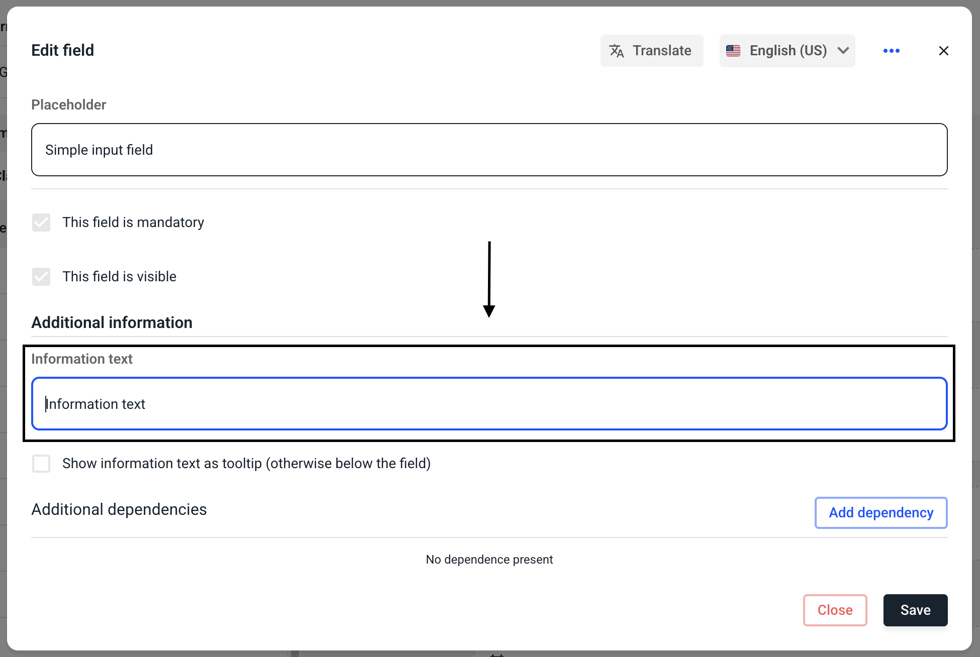To do this, click on the Show information text as tooltip checkbox (otherwise below the field) to display the information text as a tooltip.