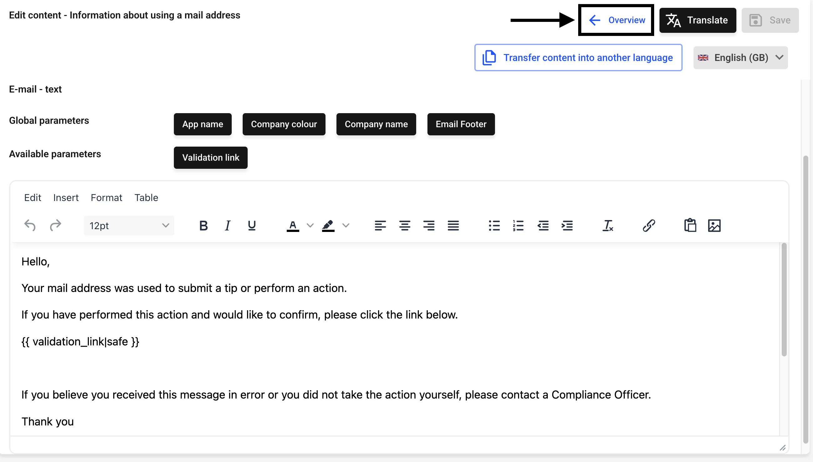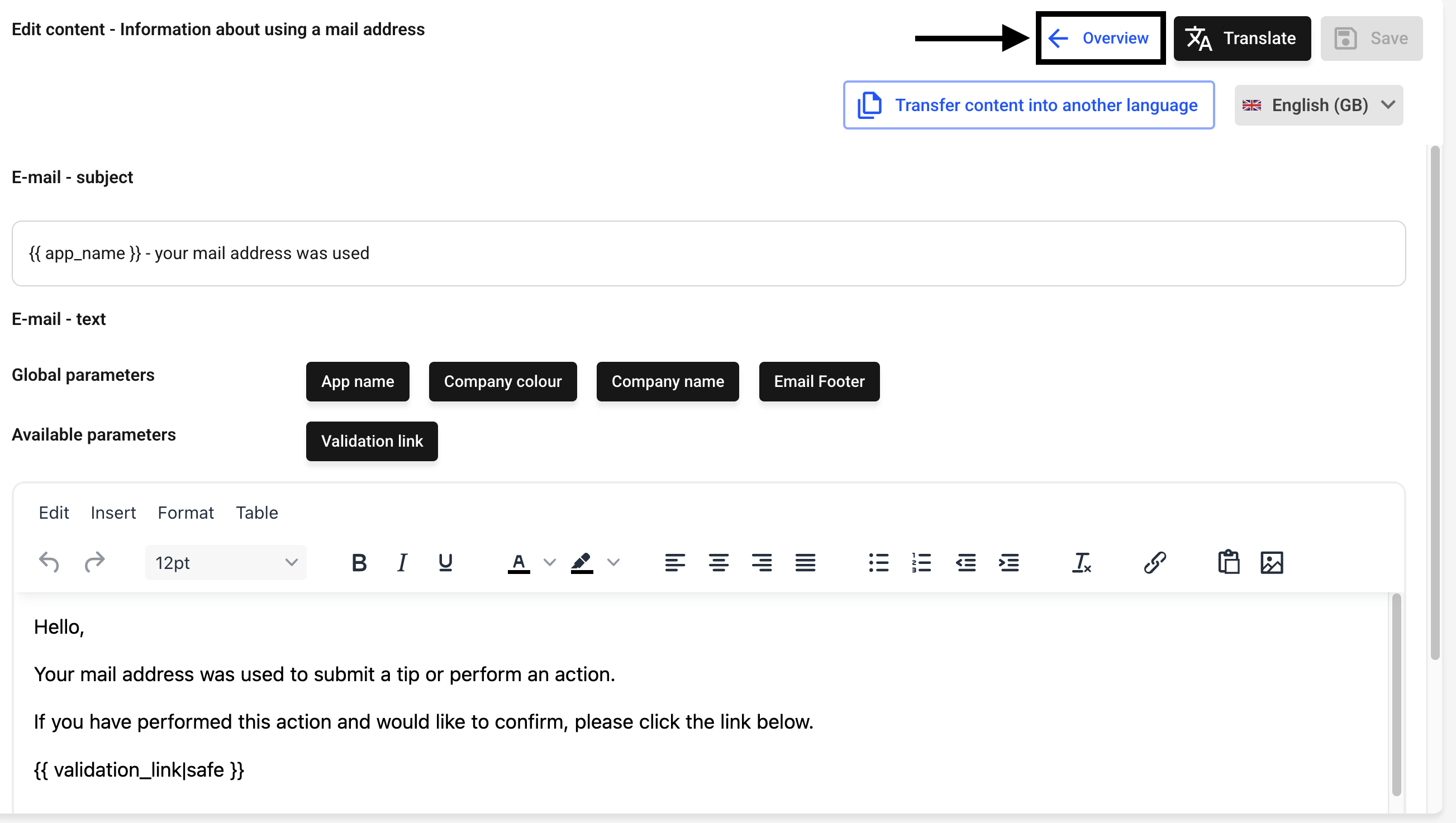 Clicking the To overview button will take you to all email texts.