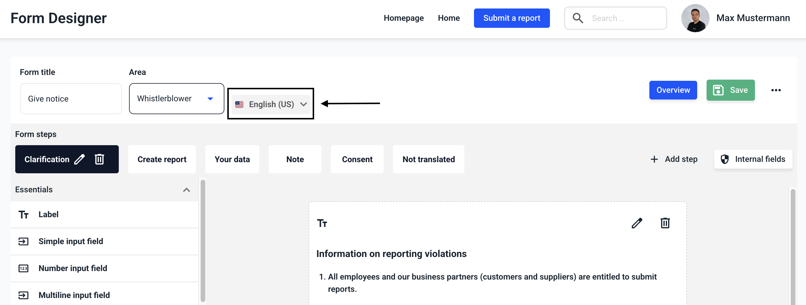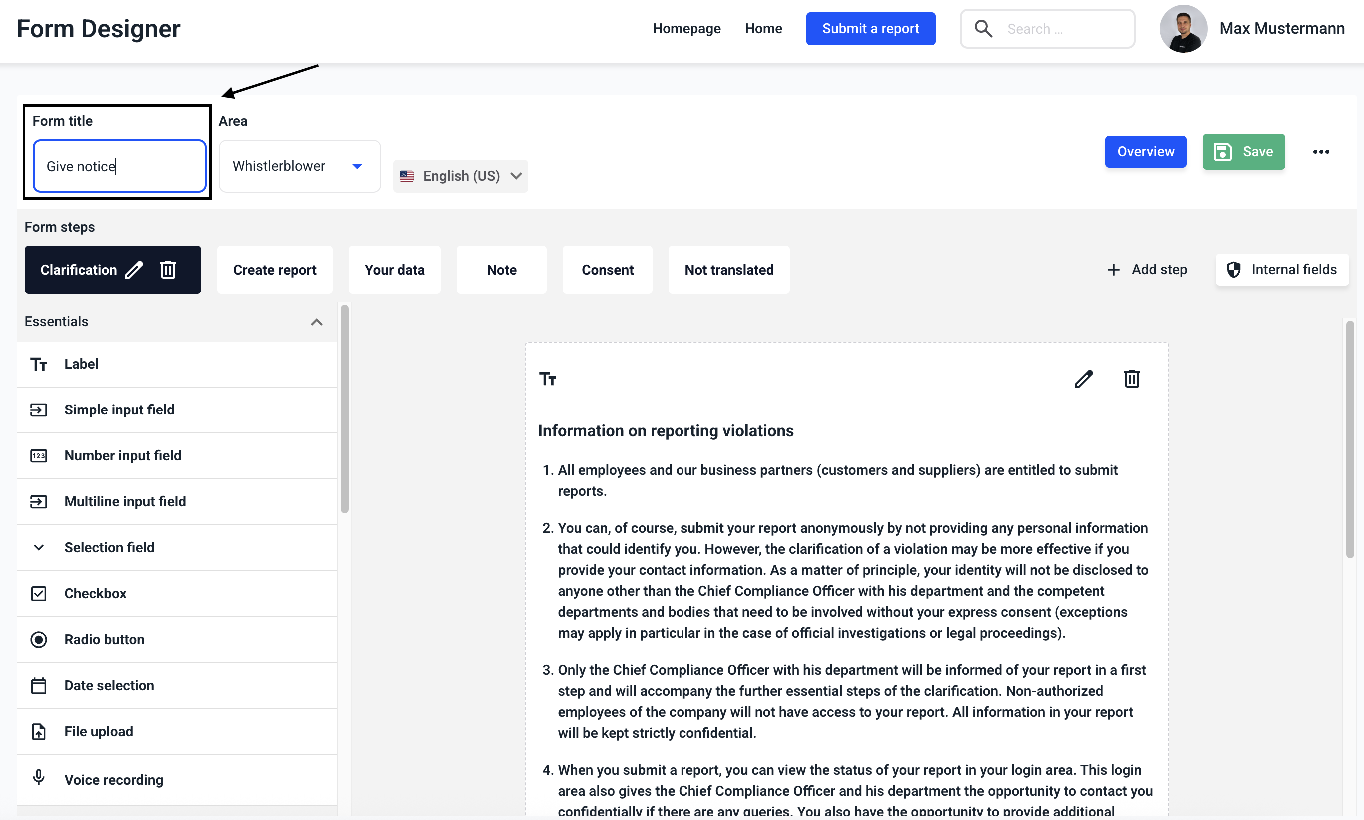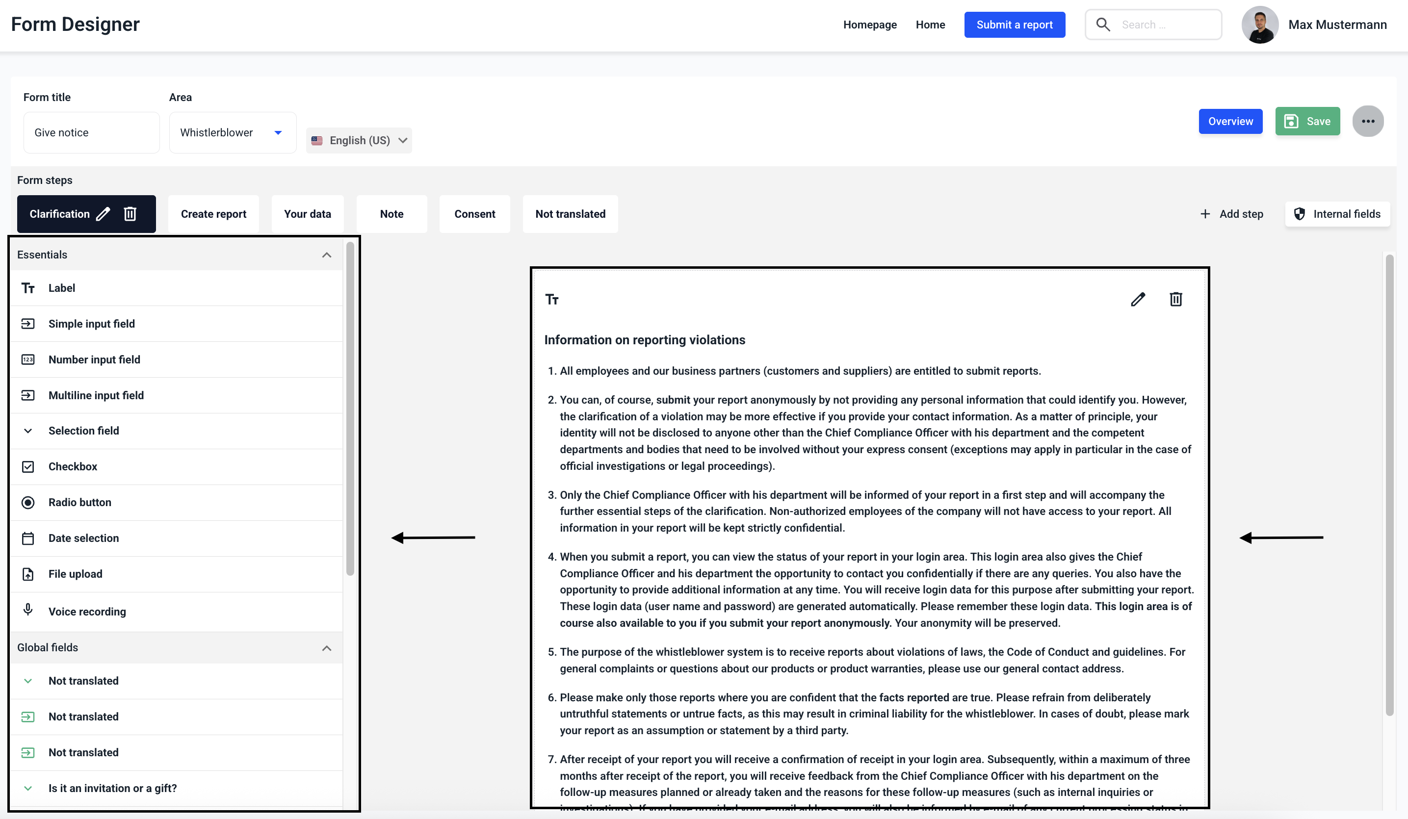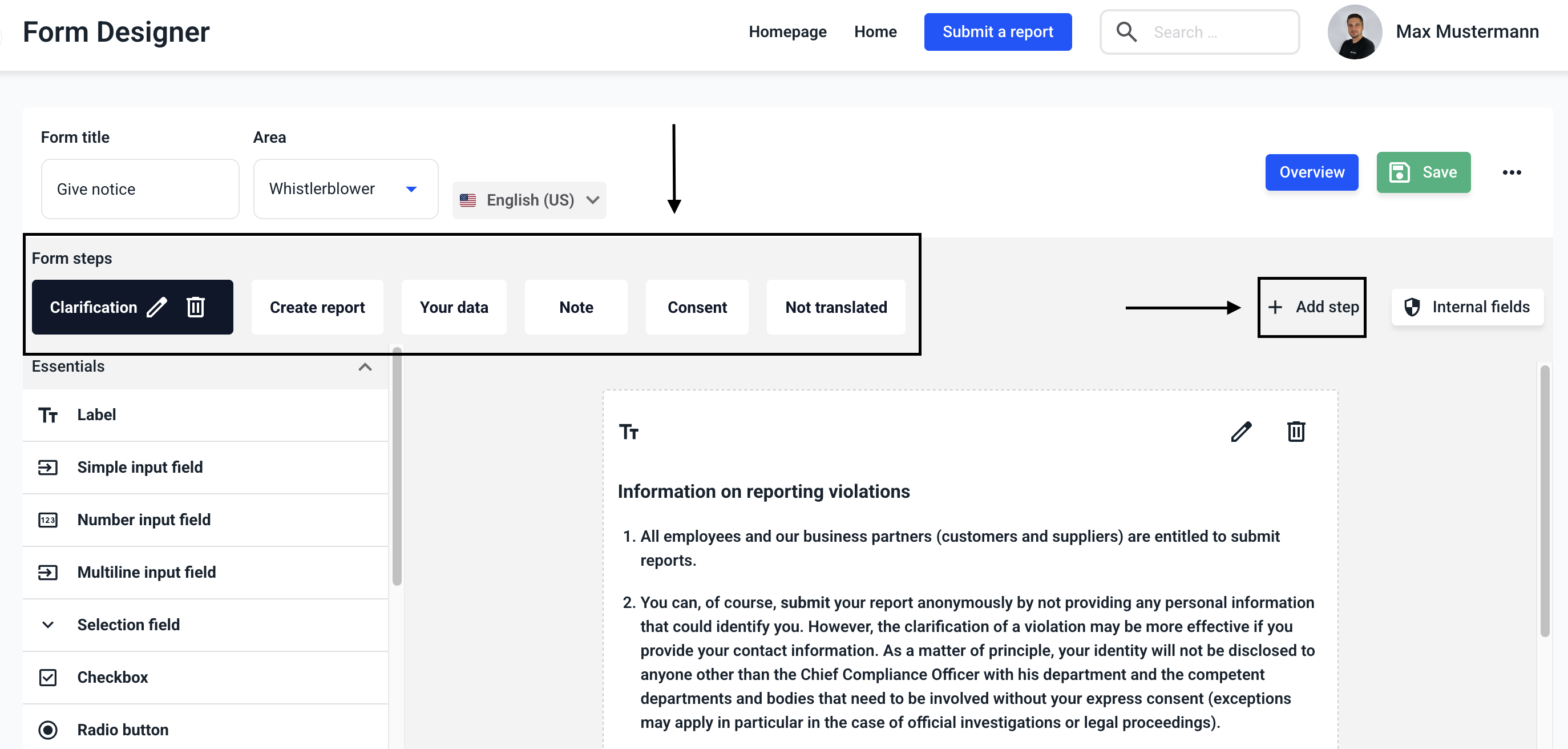 A form consists of several steps. You can find out how to create, edit, translate and delete steps within the links.