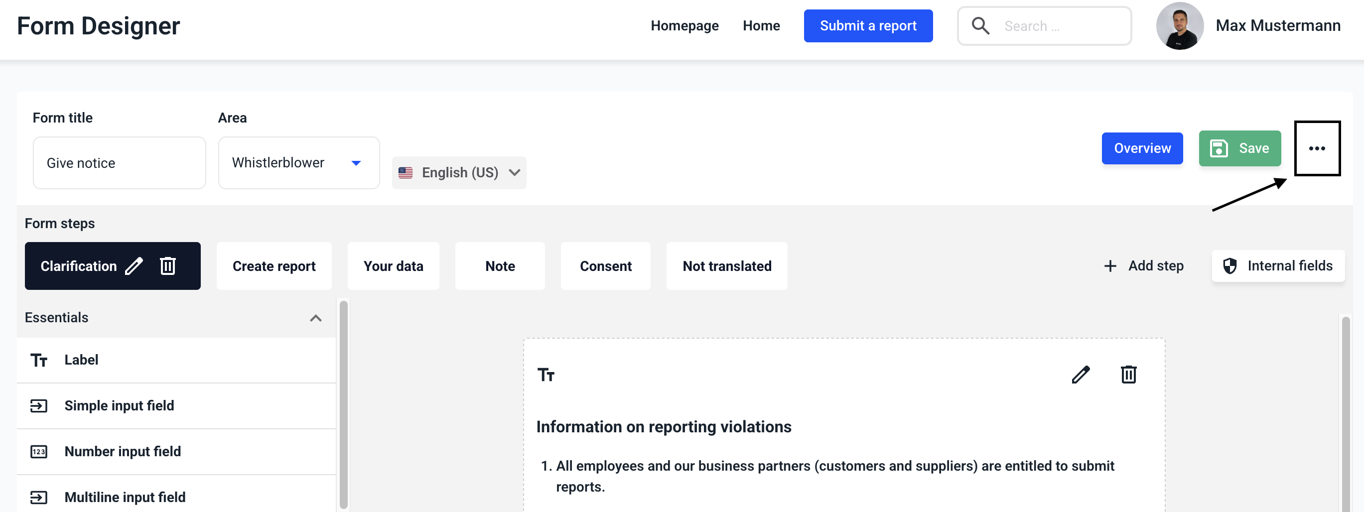 By clicking on the three dots, you can select the form title, the entire form or the Active step be translated.