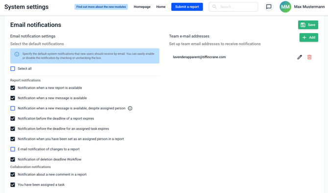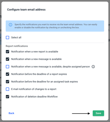 Edit the notifications you would like to receive via the team's e-mail address. You can easily activate or deactivate the notification by checking or unchecking the box.