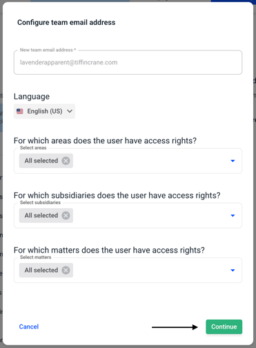 Edit the desired team email and change the access rights of the team email for areas, subsidiaries and matters.