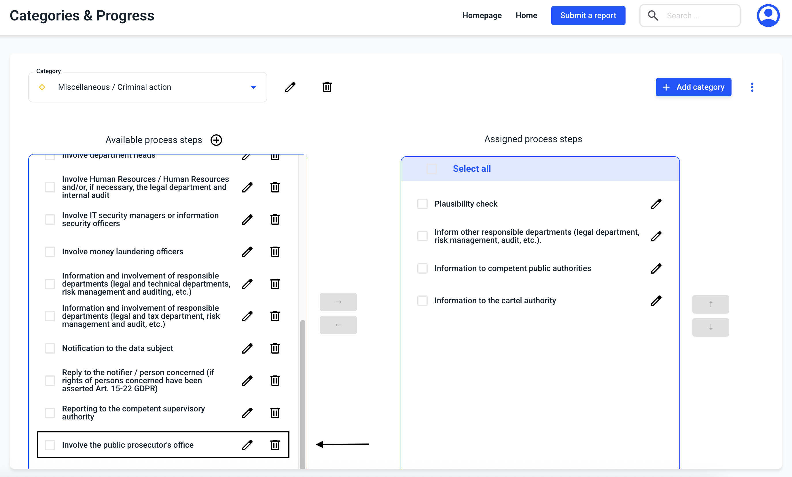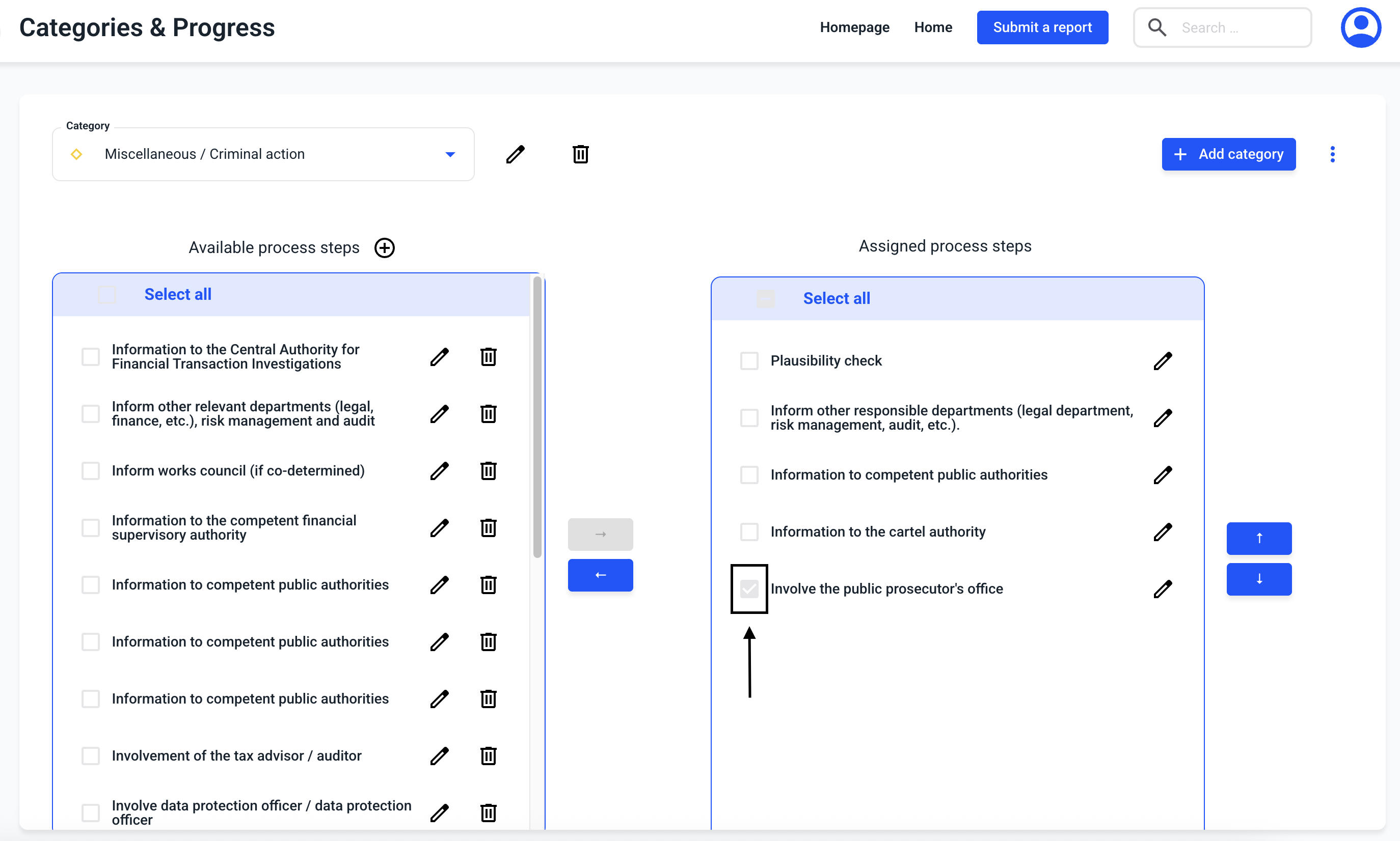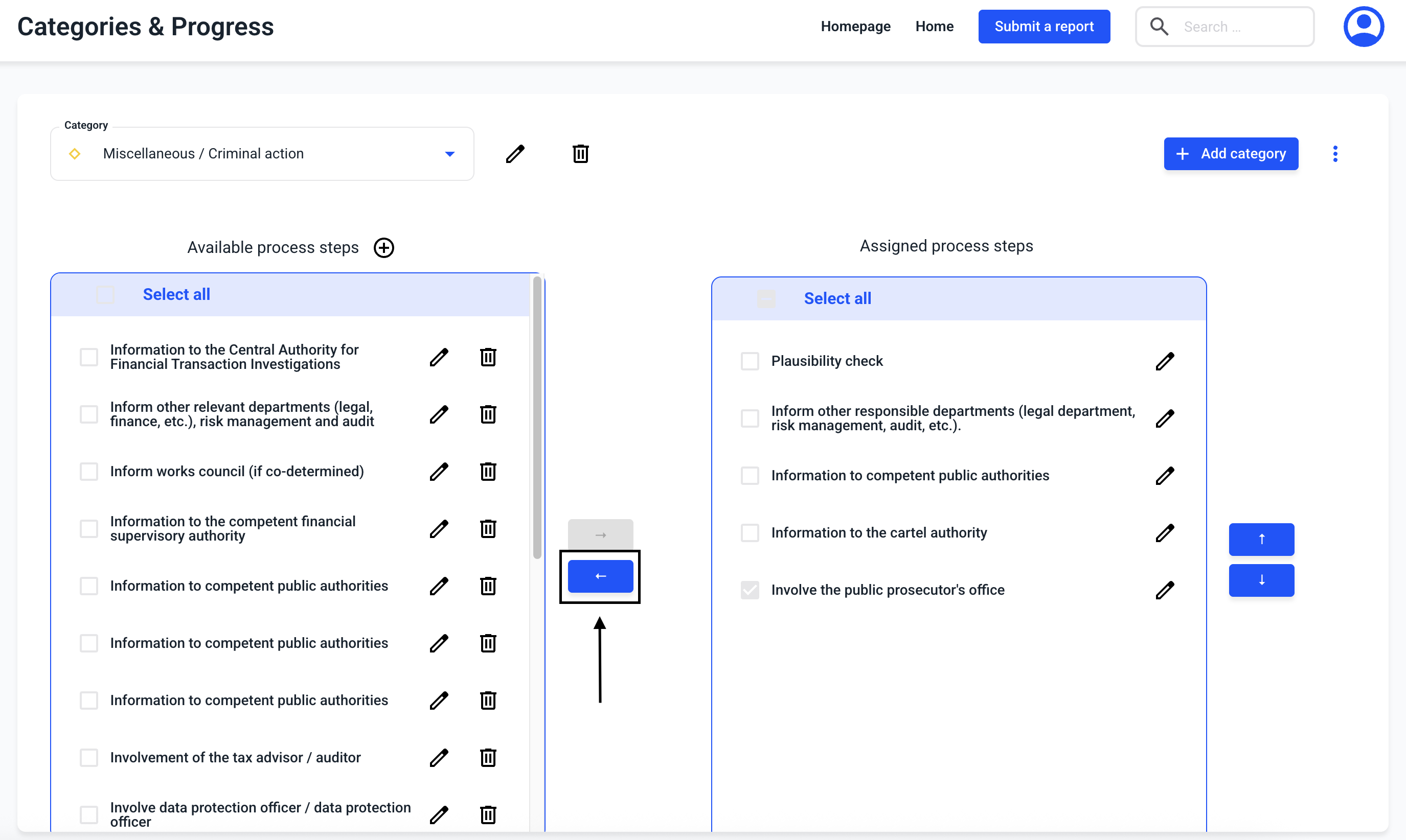 You can select the category from which one or more process steps are to be removed by clicking on the category.