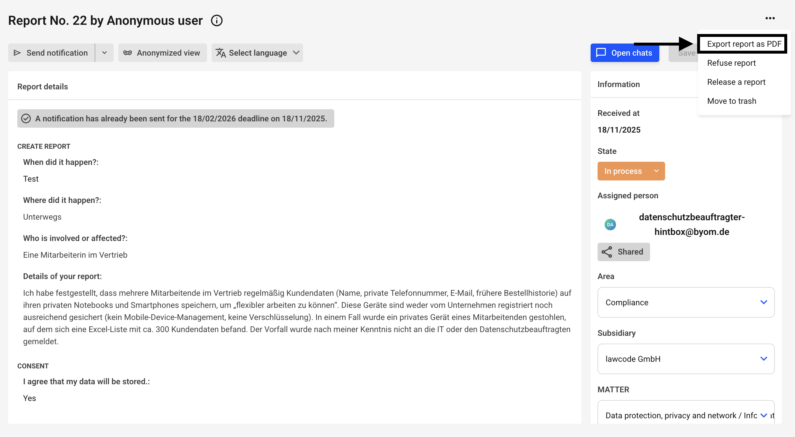 After that, click on "Export report as PDF" and then your browser should download the report as a PDF.