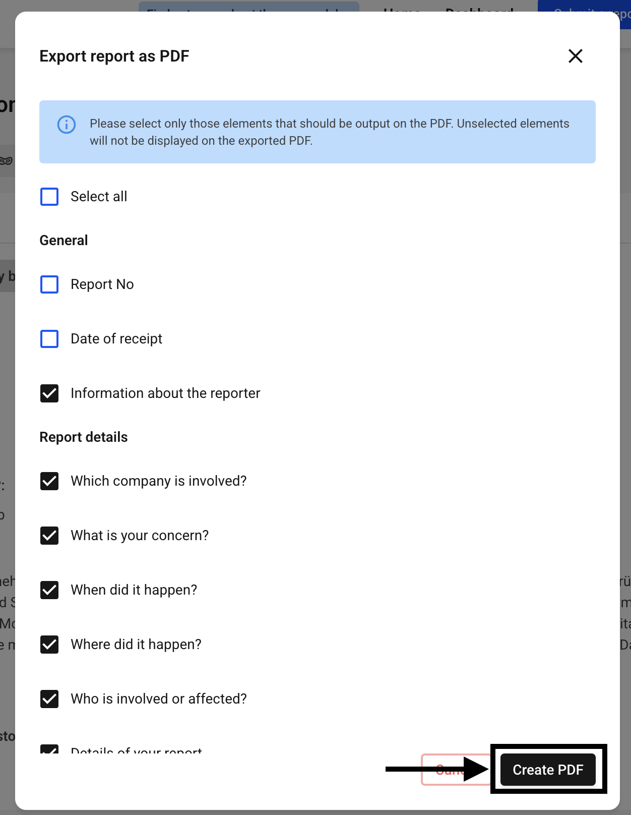 Select all the items you want to appear in the PDF document and then click Create PDF.