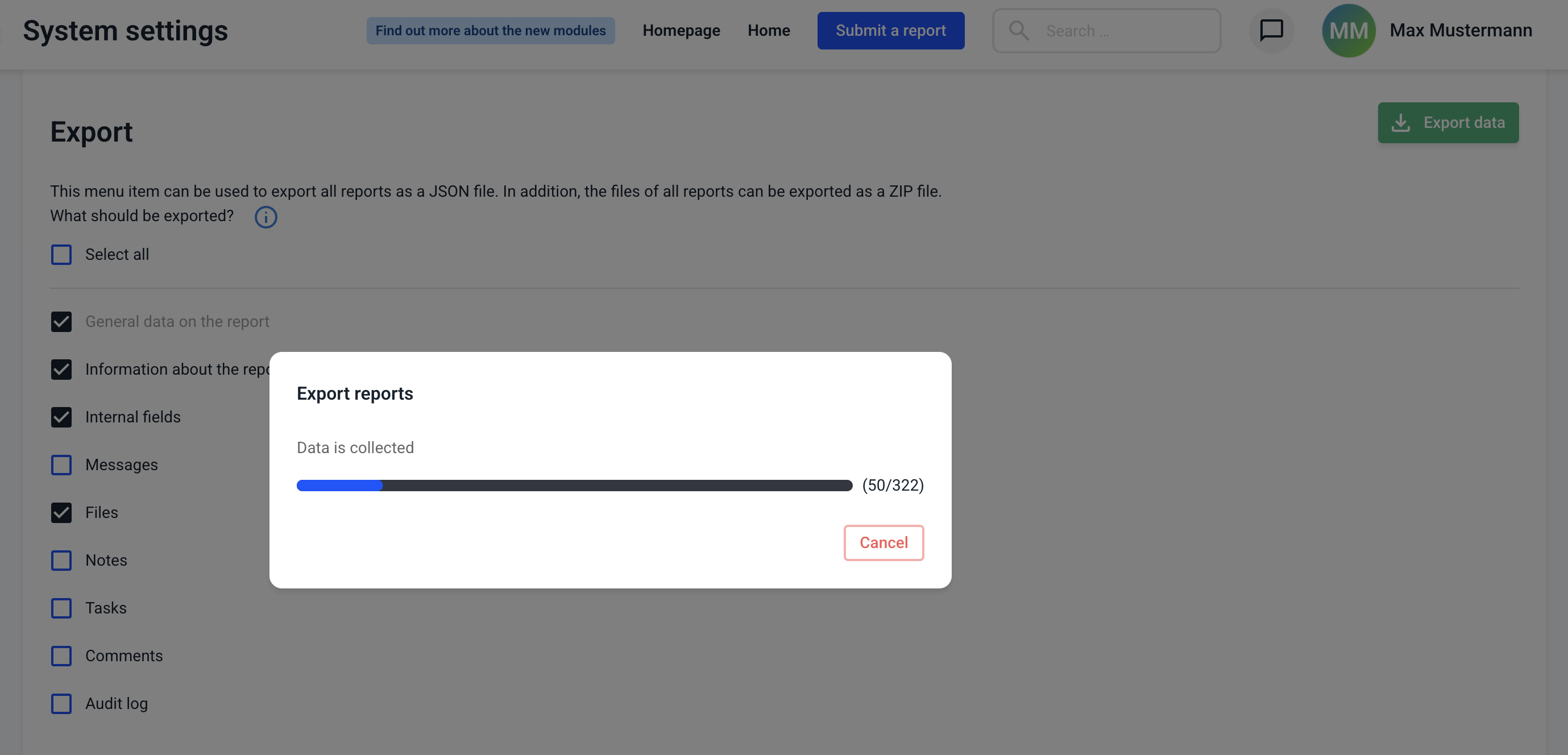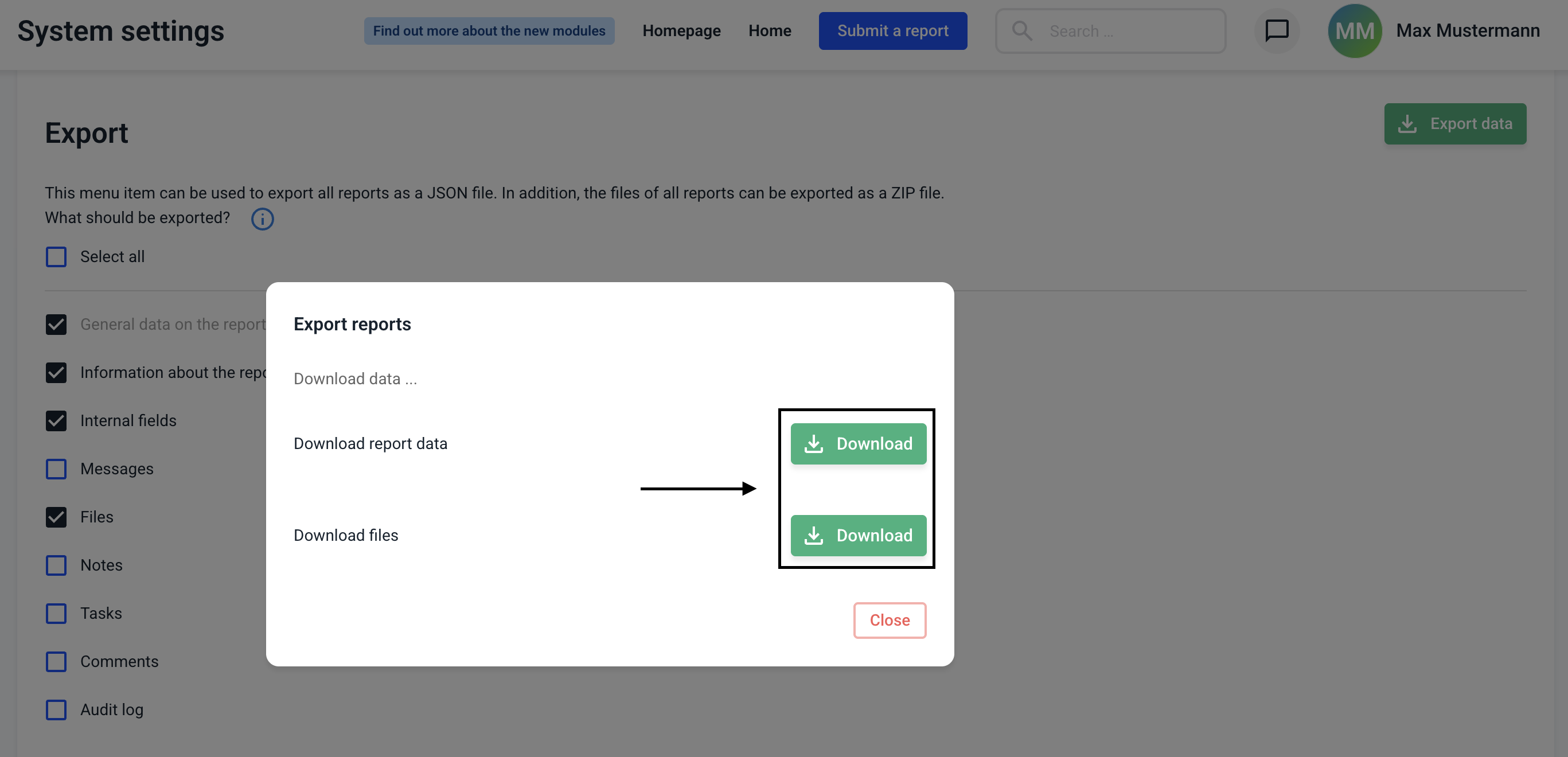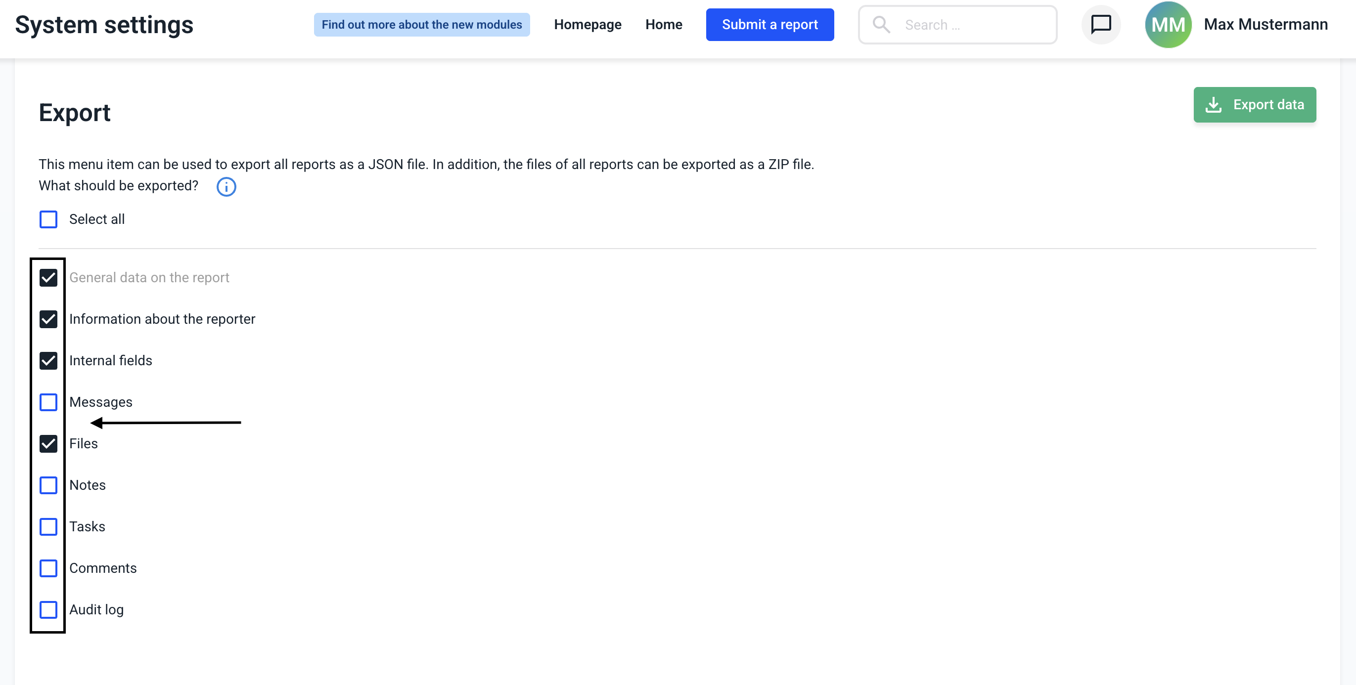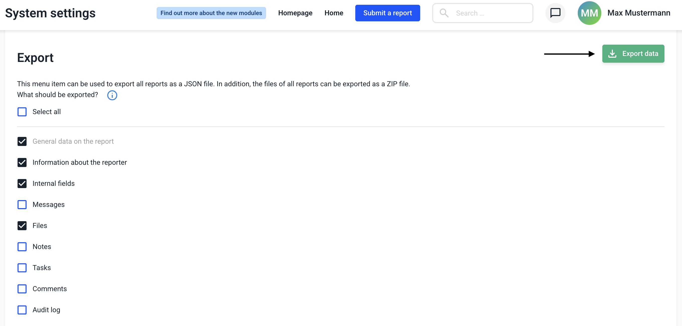 Select which data you want to export. You can decide this at the touch of a button. Report data is downloaded as a JSON file and the files as a ZIP file.
