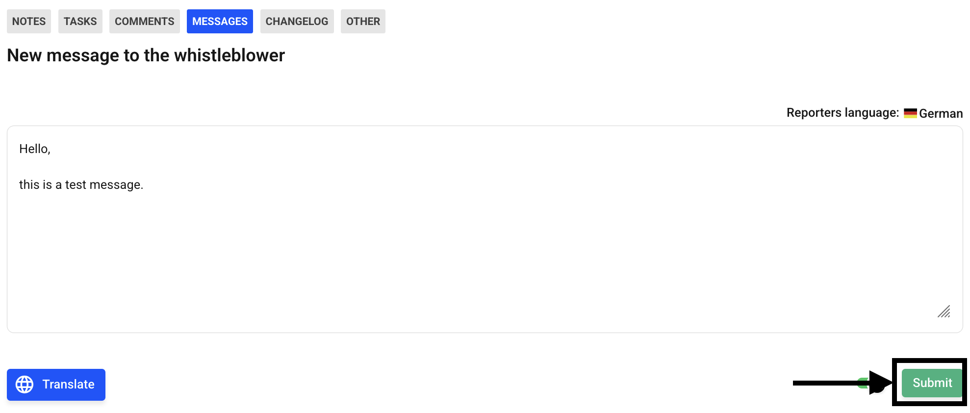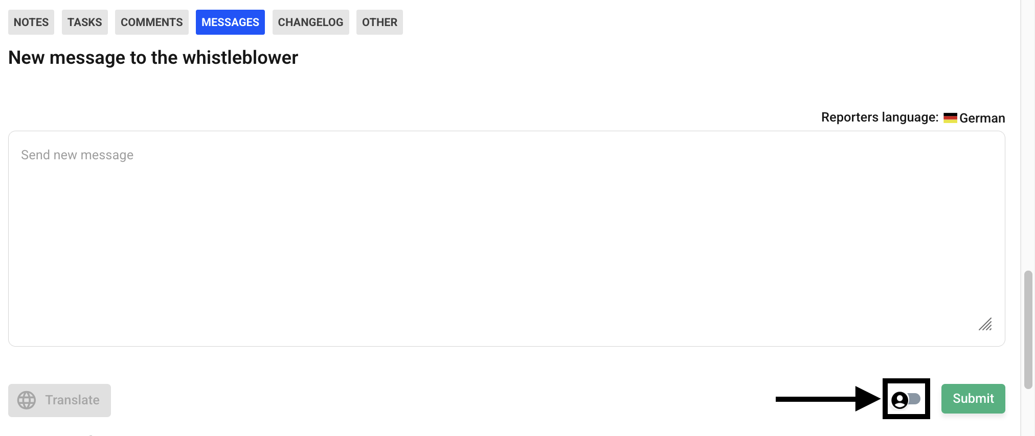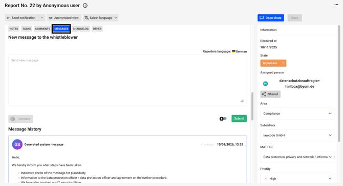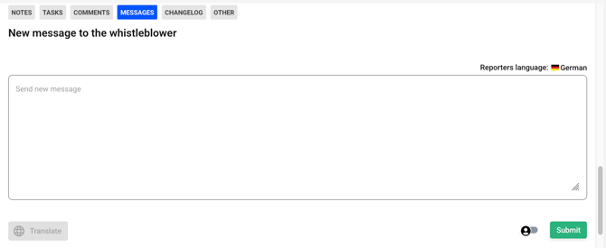 Use the input field to enter messages, write your desired message in the text field, make sure that anonymization is activated and click on the “Submit” button to send the message to the whistleblower.