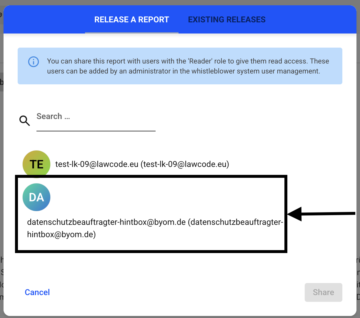The selected user will be grayed out, with a click on Share you can now specifically share the individual report to the selected report.