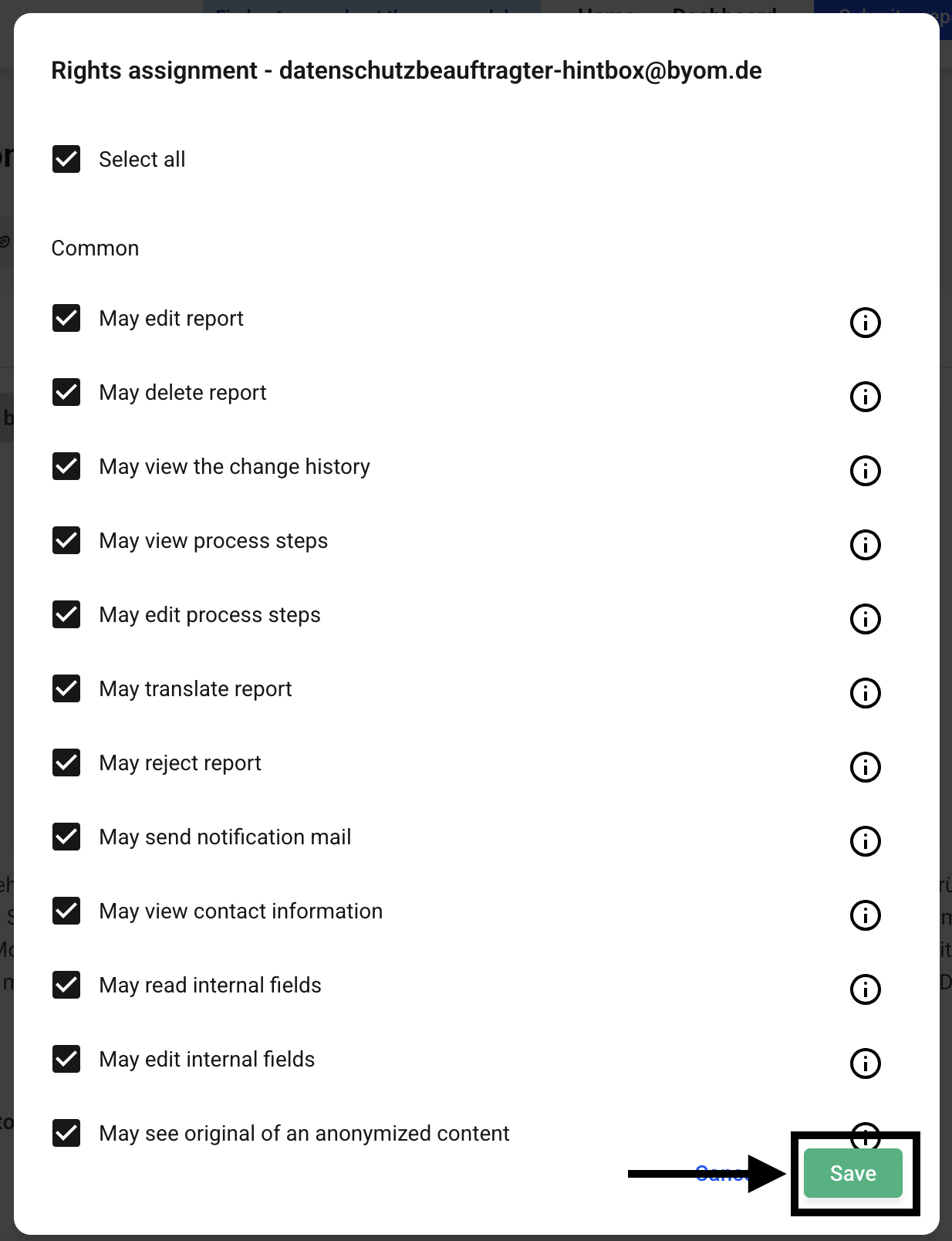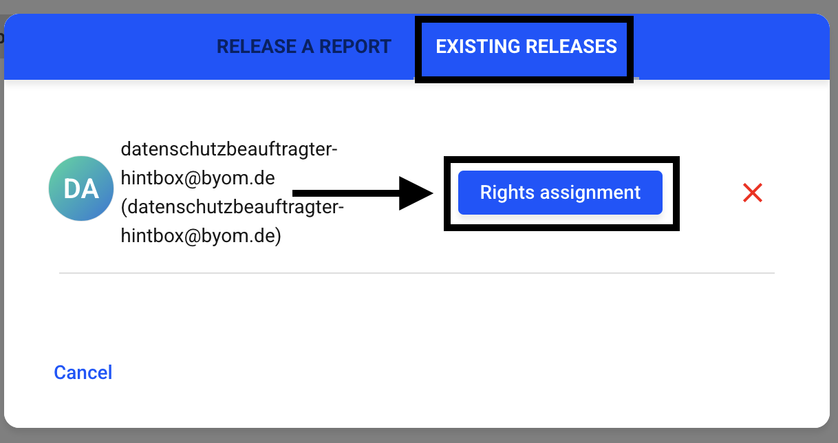 The reader is now in the existing permissions. Click on Assign rights to adjust the rights of the reader in relation to the report.