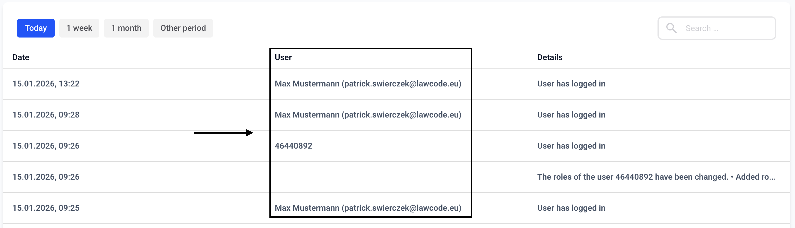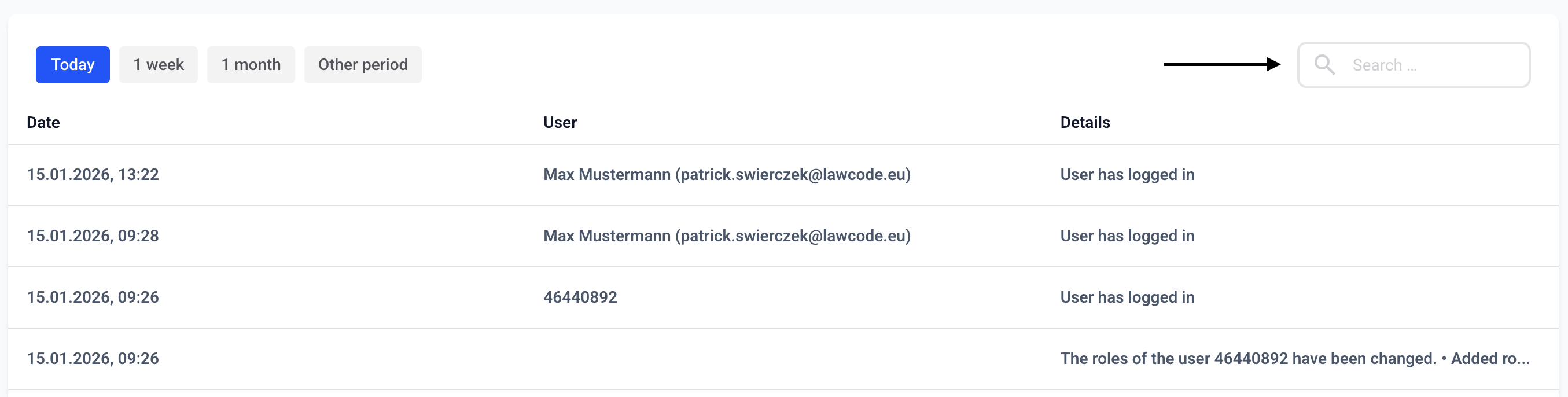 Period - as soon as the audit log opens, the period is filtered to the current day. However, there is also an option to filter by a week, month, year or other time periods.