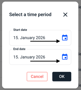Other period - This allows you to define your own period for the view. As soon as you click on Other period, the following window opens. Define the start and end dates using the calendar icons and then confirm your entries with OK.