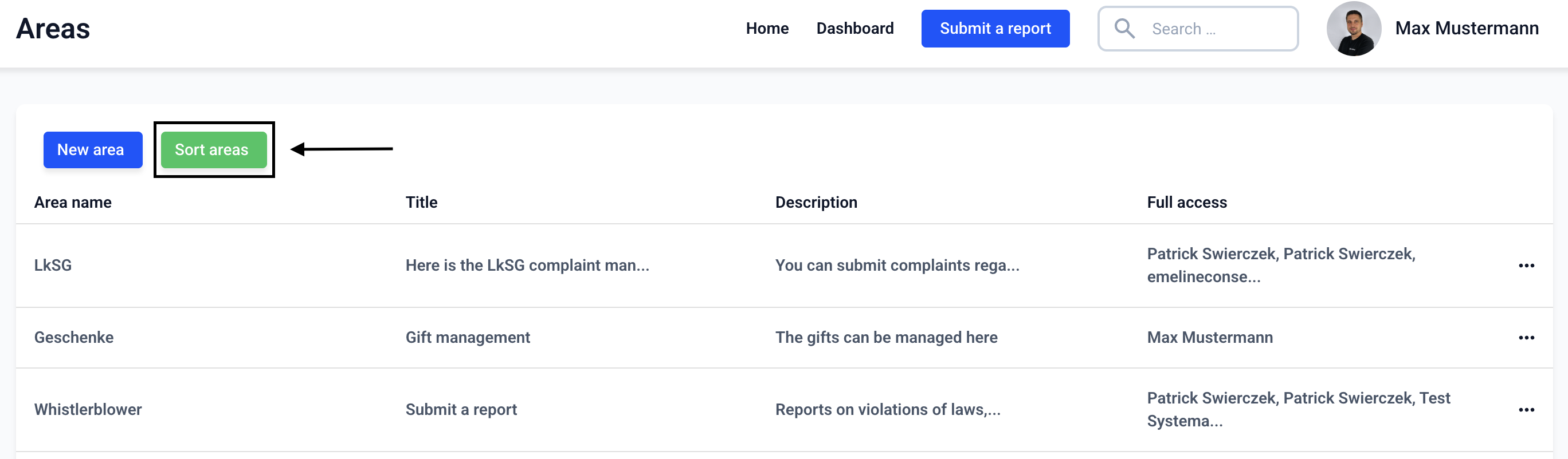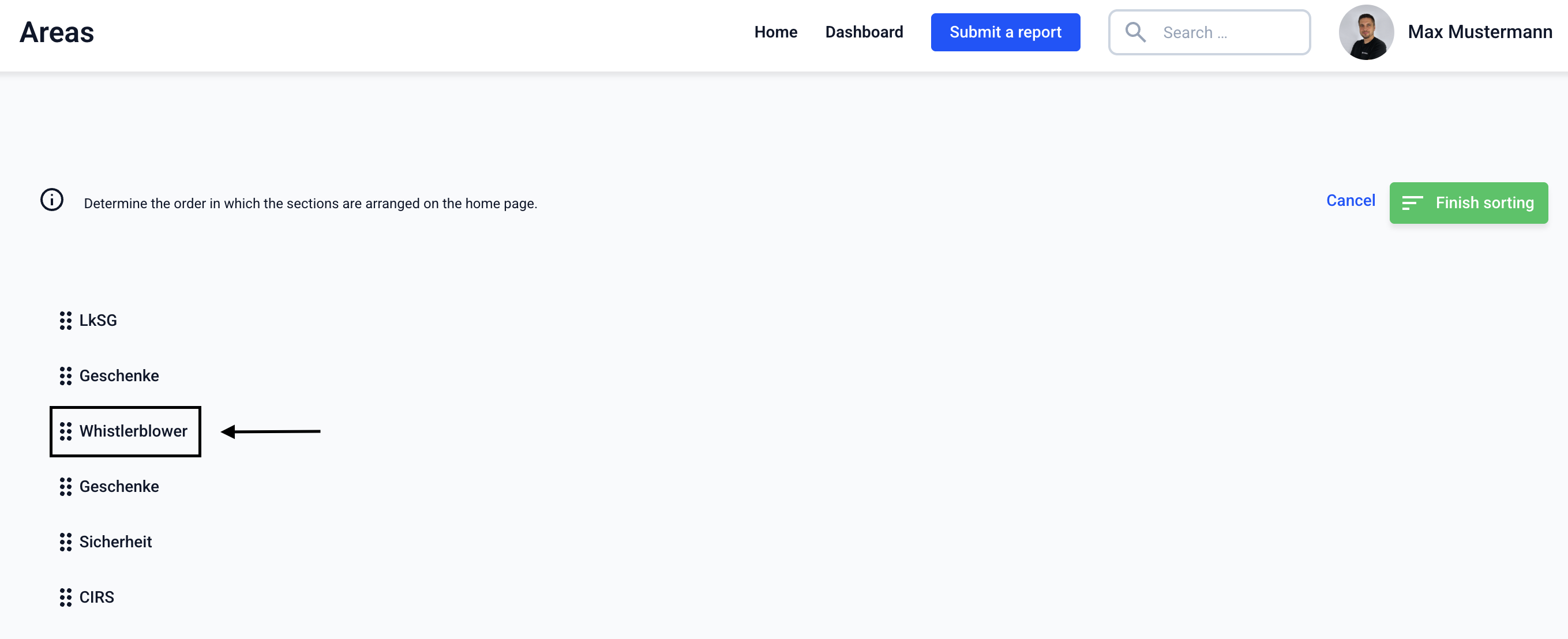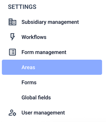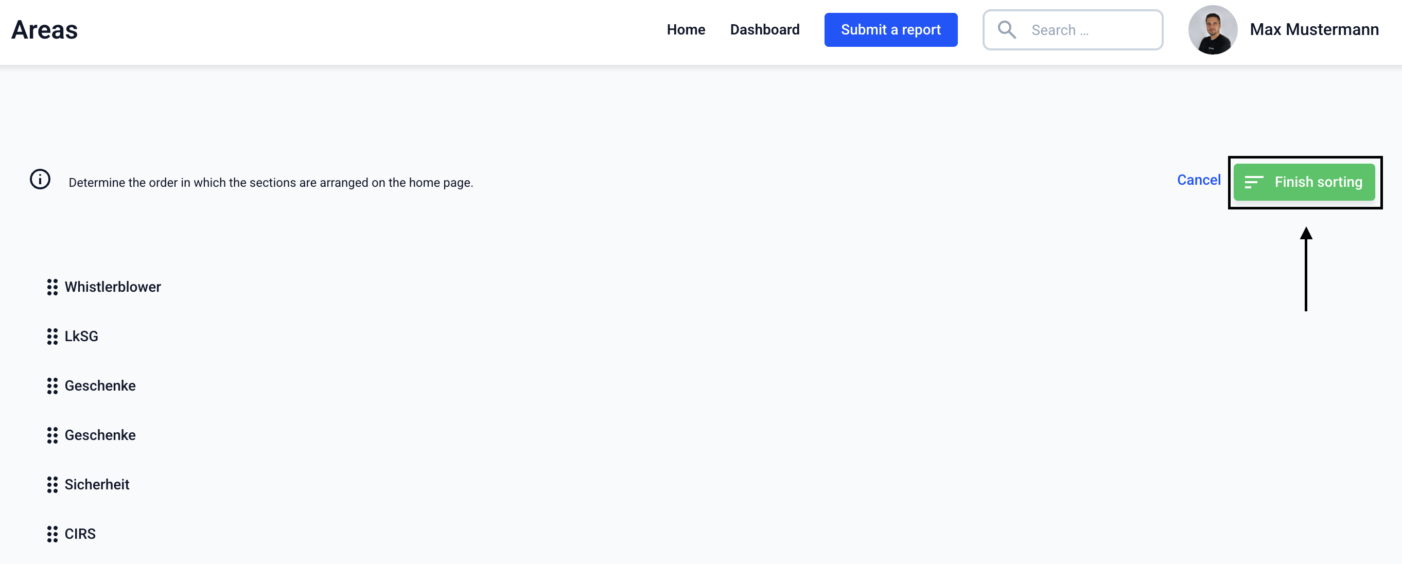 The areas can be sorted on the start page. To do this, navigate to the Form management.
