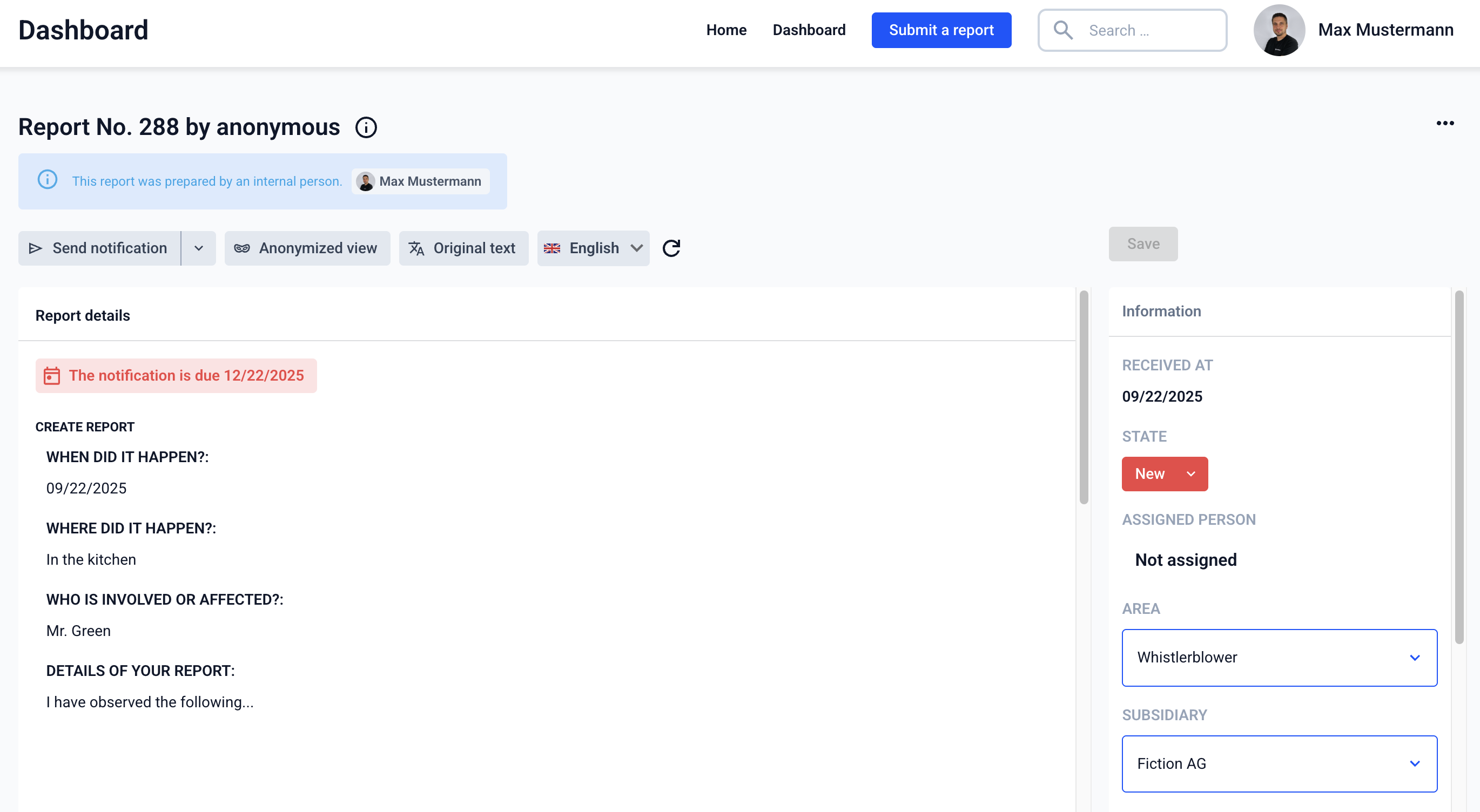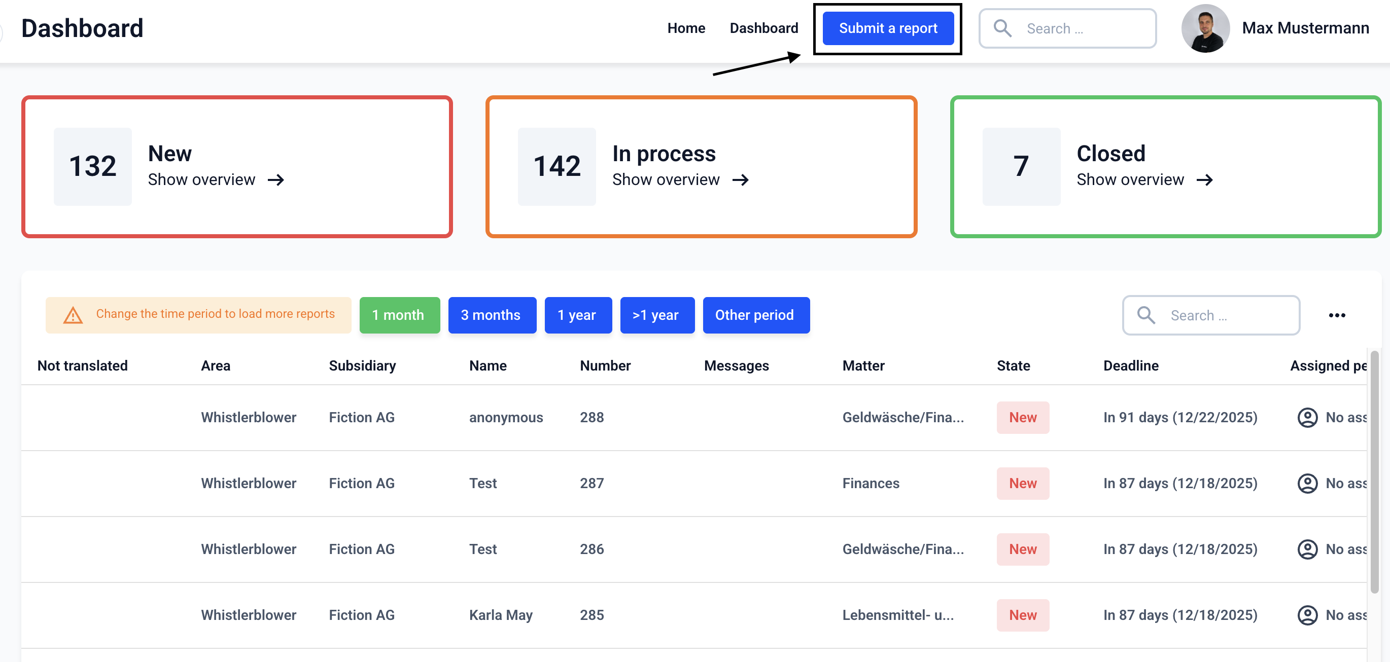 As a Compliance Manager, you can submit a report. To do so, click on Submit a report.