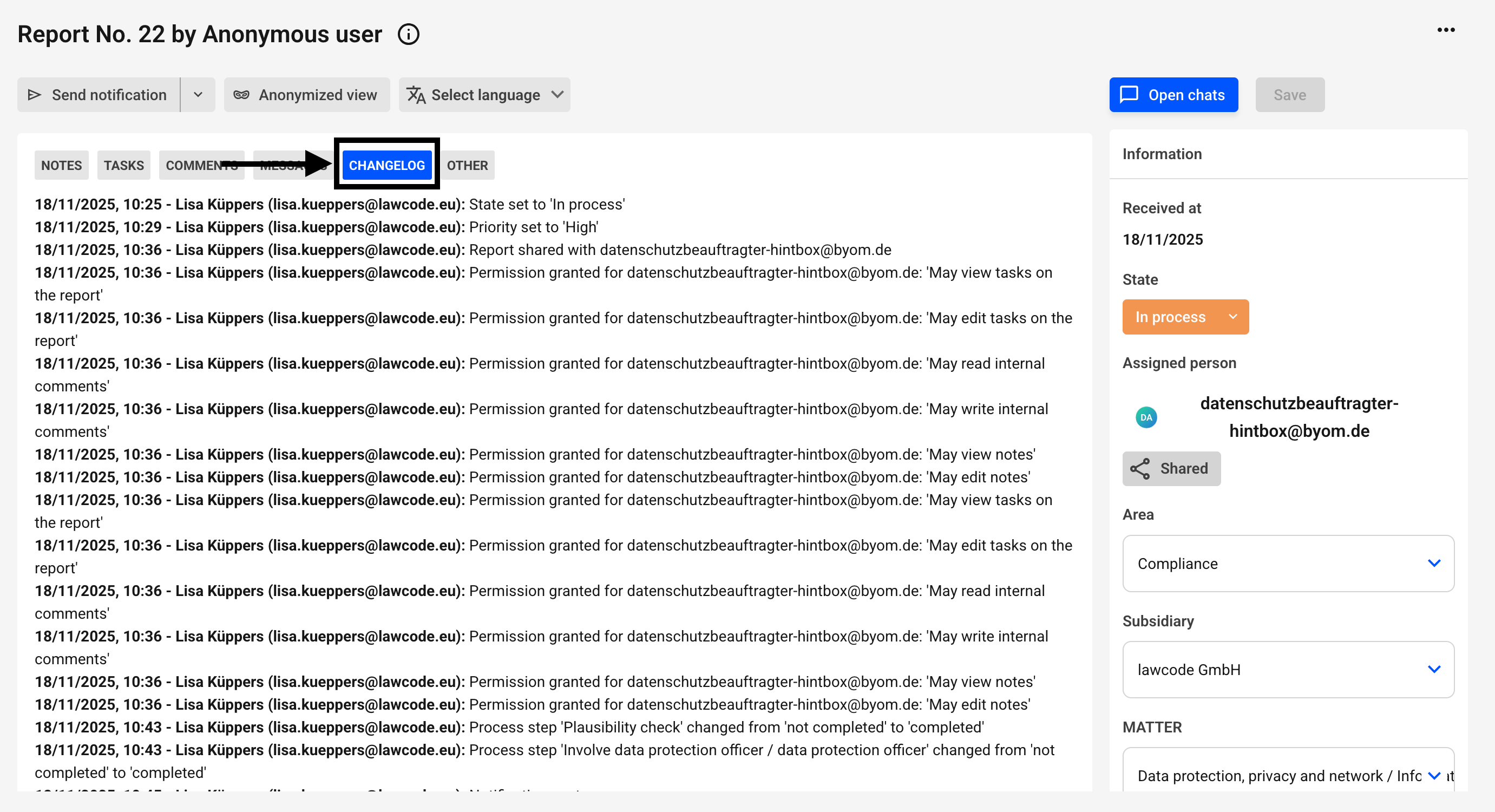 How can I track changes in the note? This chapter explains how you can track changes in the note. All changes and adjustments within a note are tracked by the change history. This means that you can view all changes made to the note in the history by clicking on “Change history”.