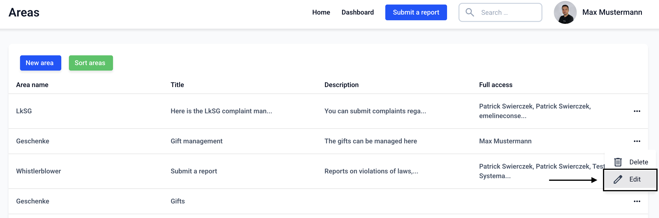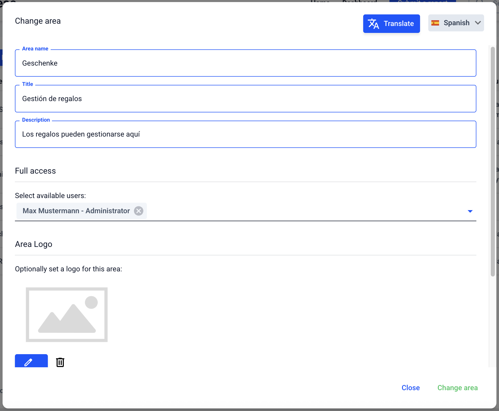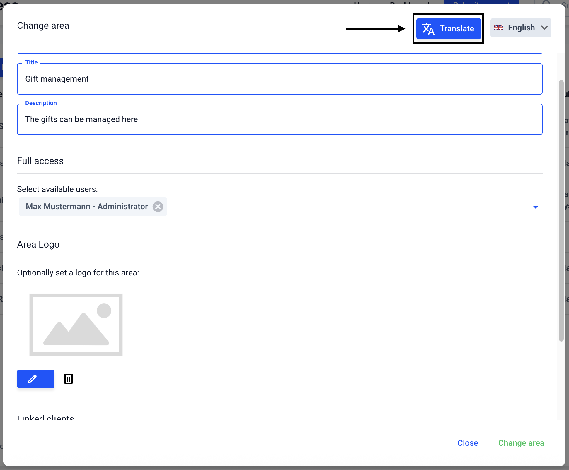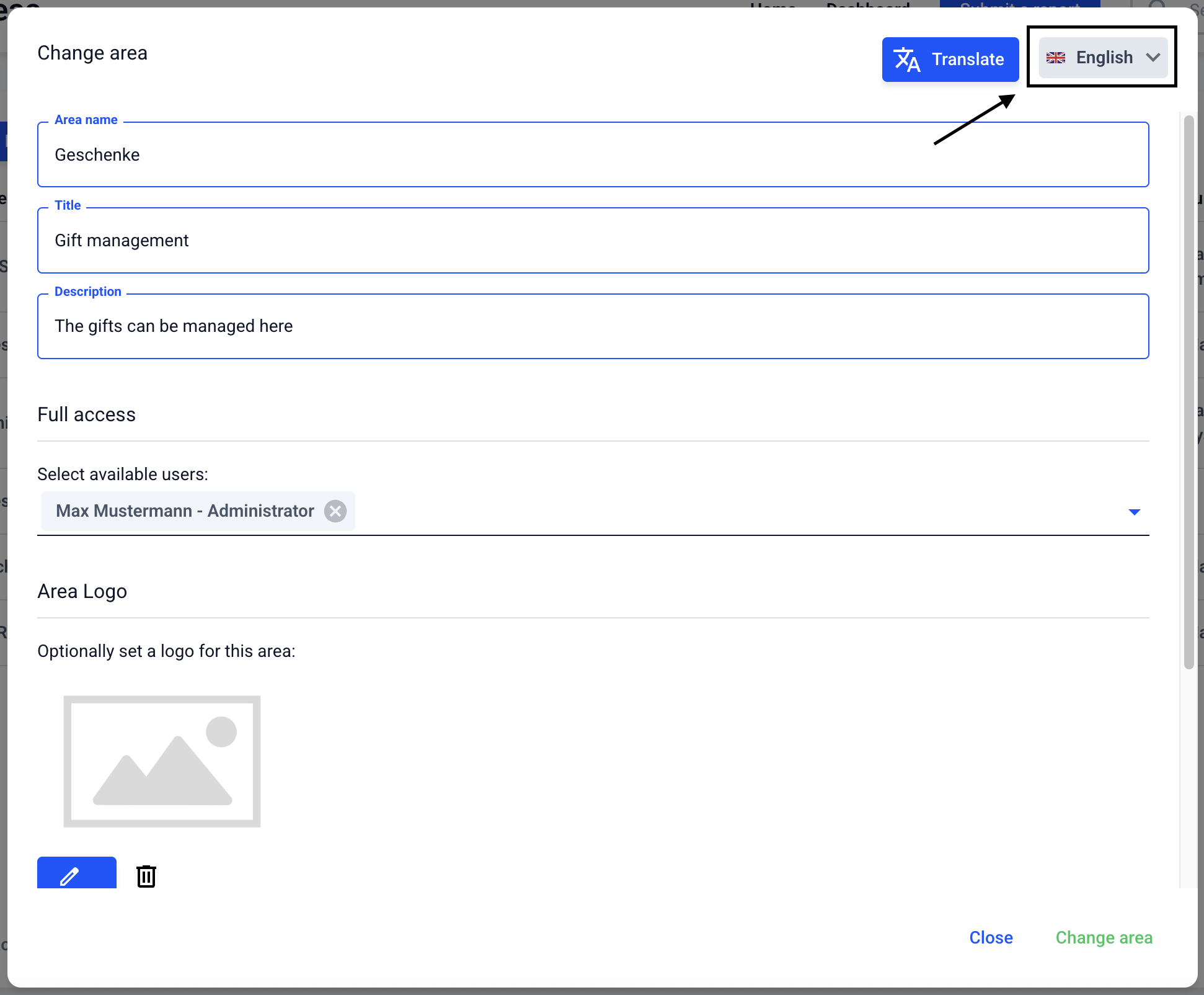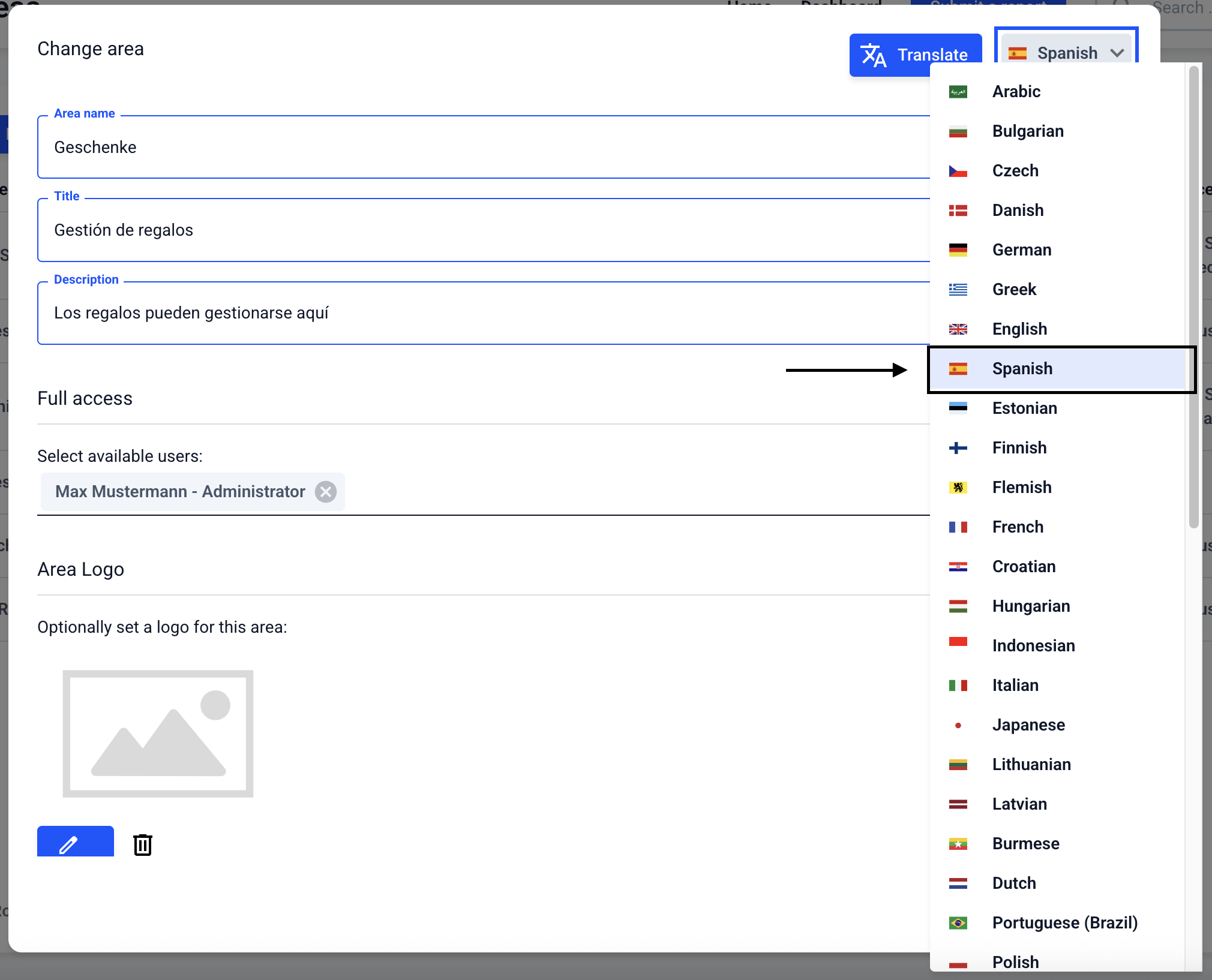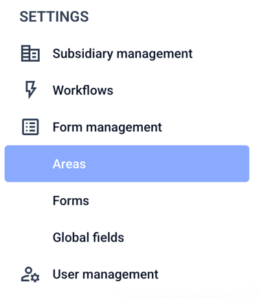 Areas can be translated. To do this, go to the Form management.