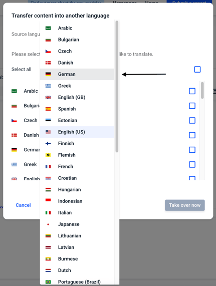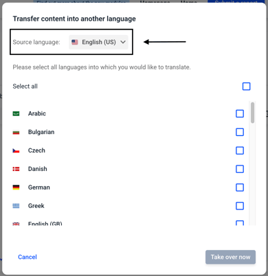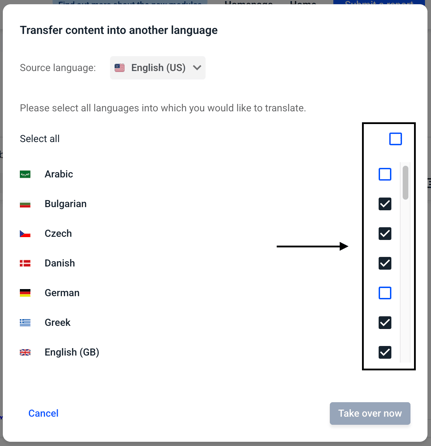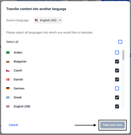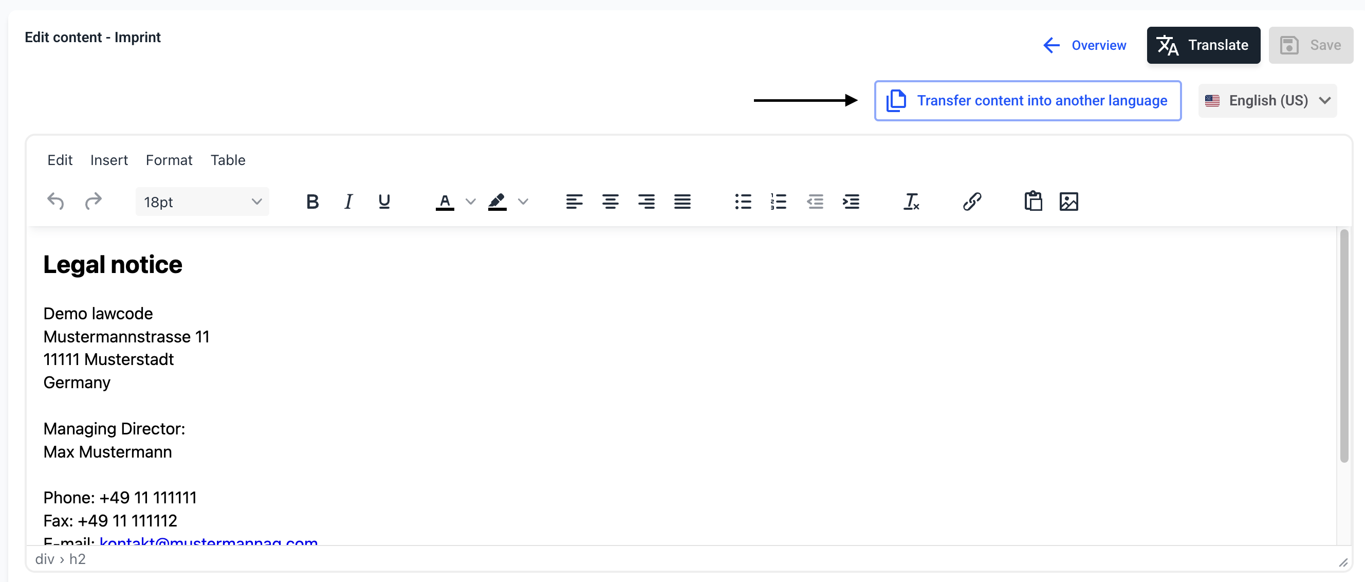 Instead of translating or manually editing legal texts, it is possible to transfer them. The text will be transferred to all selected languages with content and formatting. To edit the legal texts, click Settings → System → Legal texts.