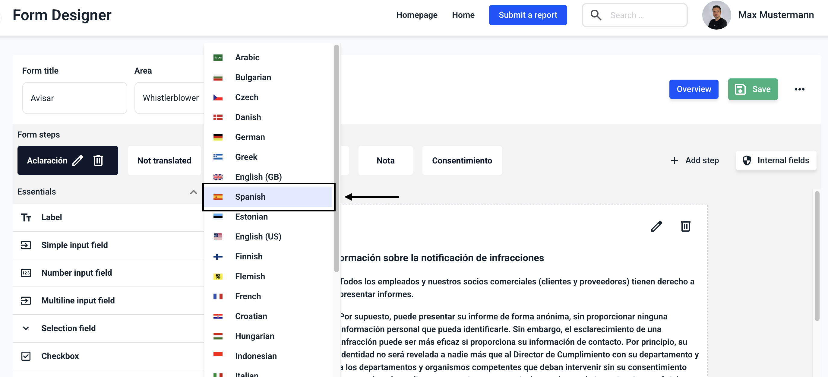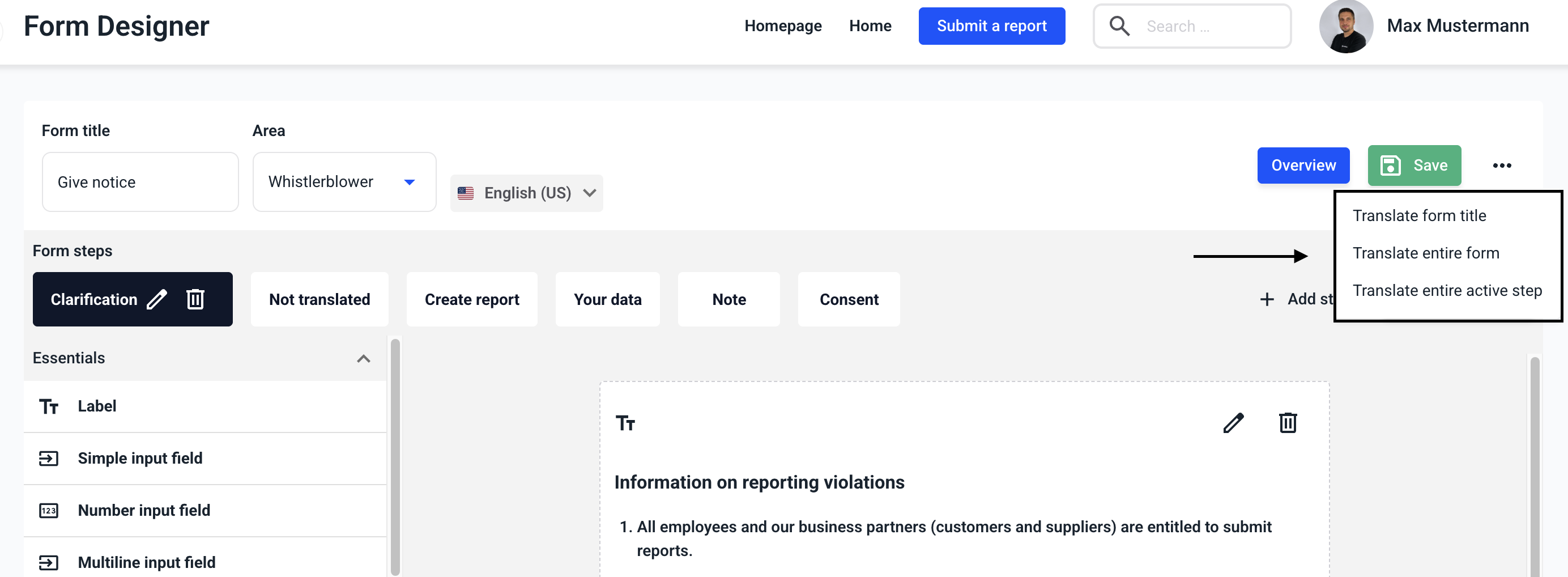 Choose whether you want to display the form title, the entire form or the entire active step want to translate.