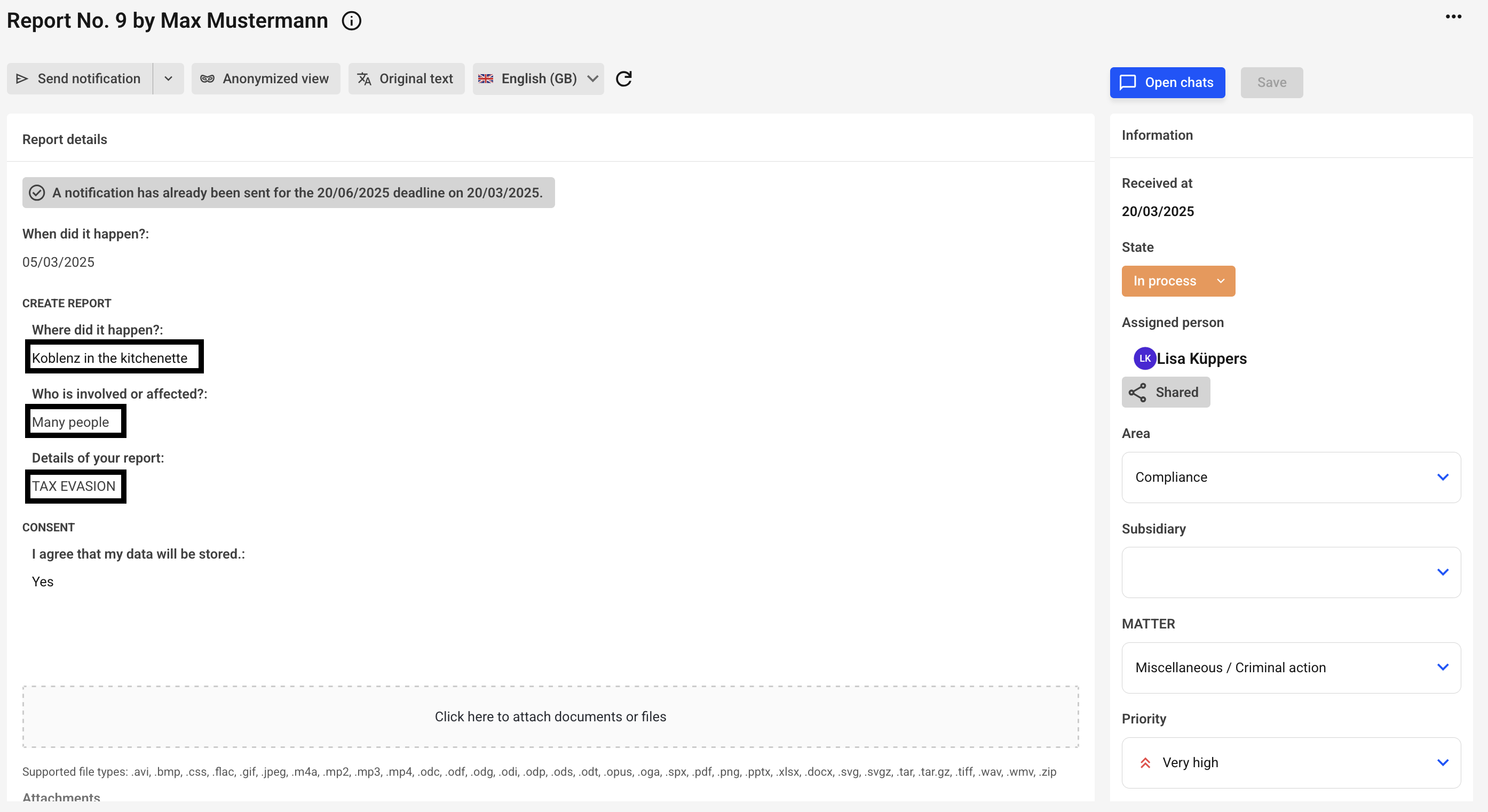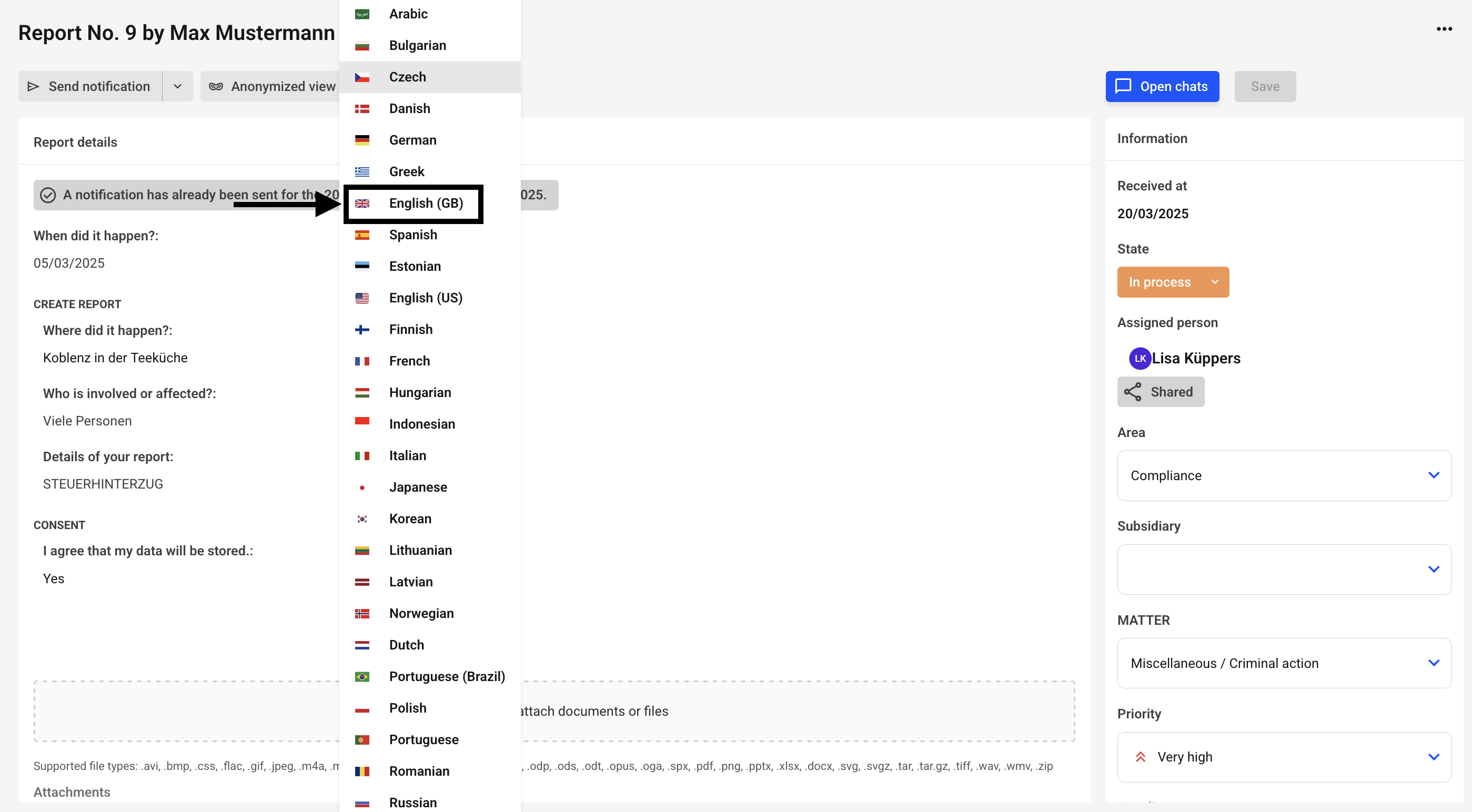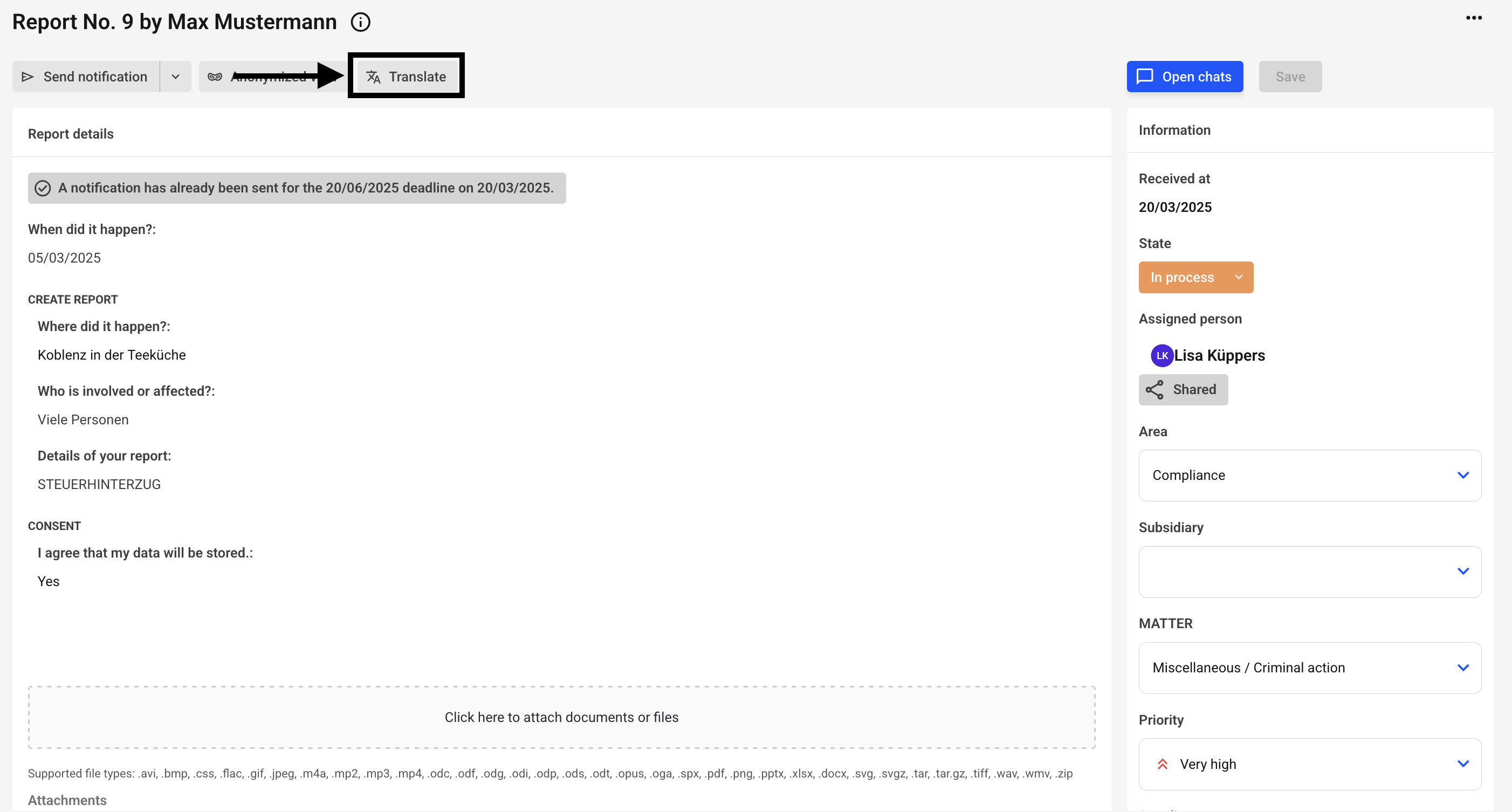 You can easily translate the report information "Details about your report", "Who is involved?" and "Where did it happen?" by clicking the "Translate" button.