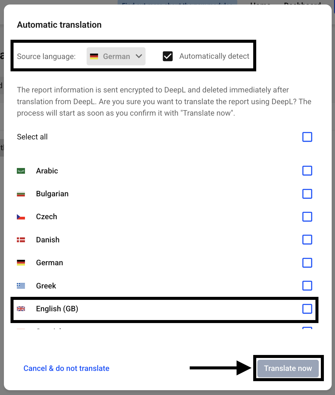 In this example, we translate from the source language English to German. To translate, select the desired language in the dialog. Once you have selected the desired languages for translation, confirm the selection by clicking "Translate now".