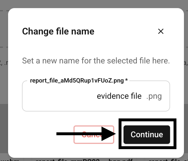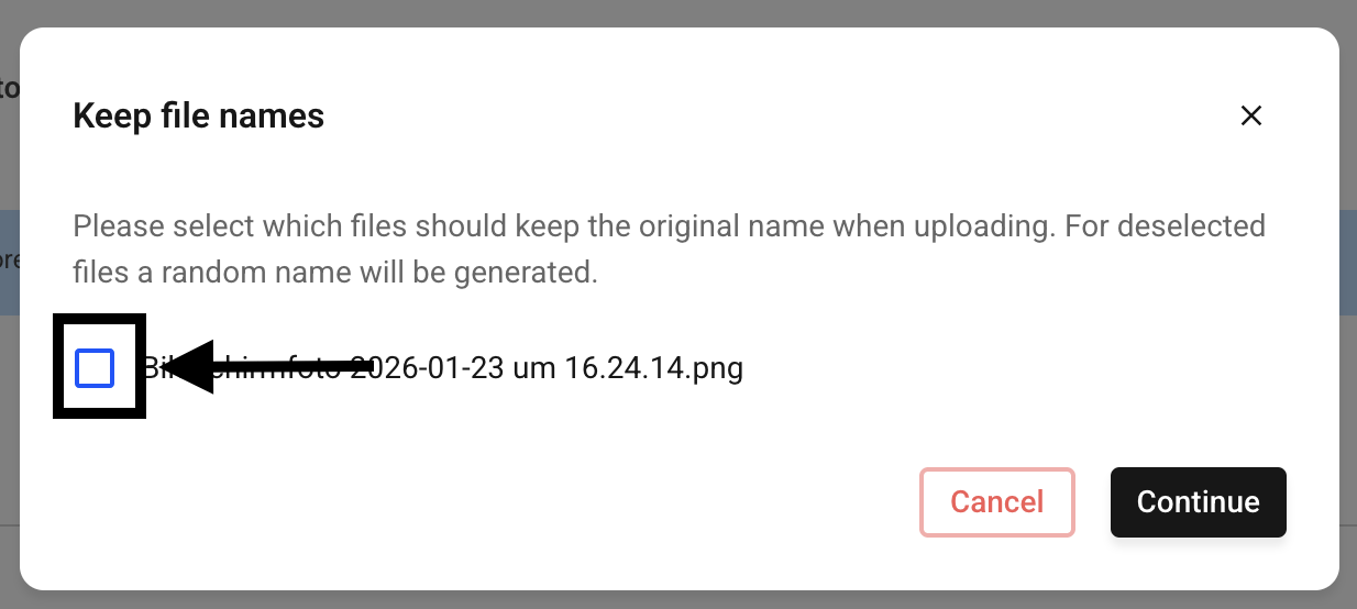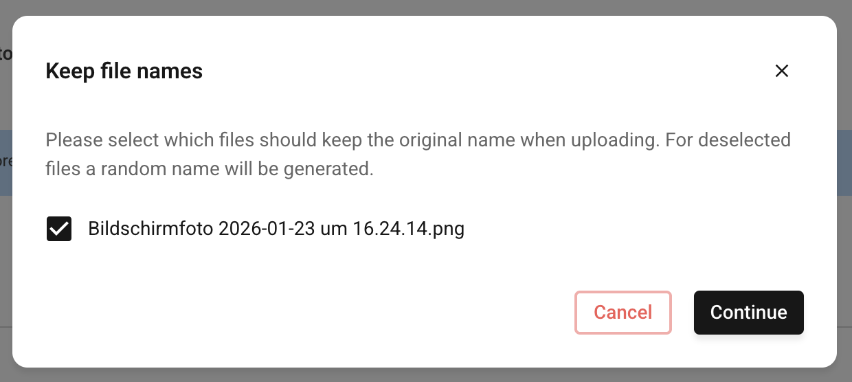 After you have uploaded the file, you have the option to keep or adjust the file name assigned before the upload.