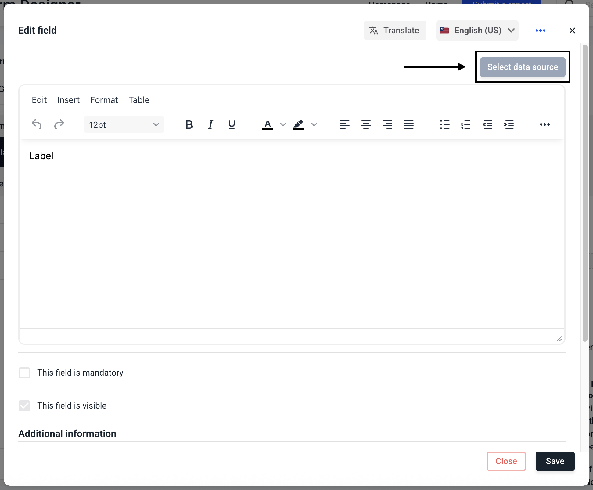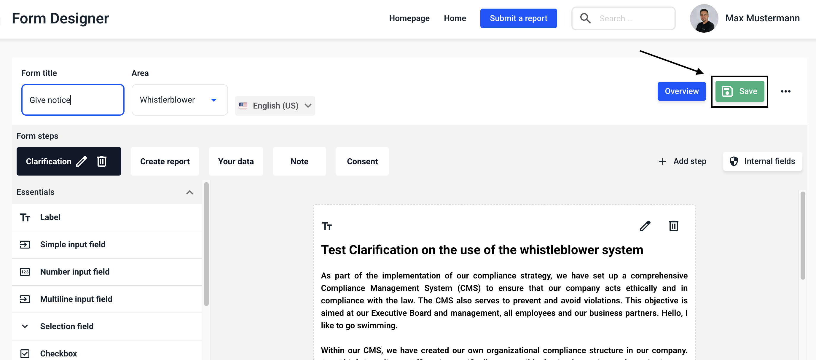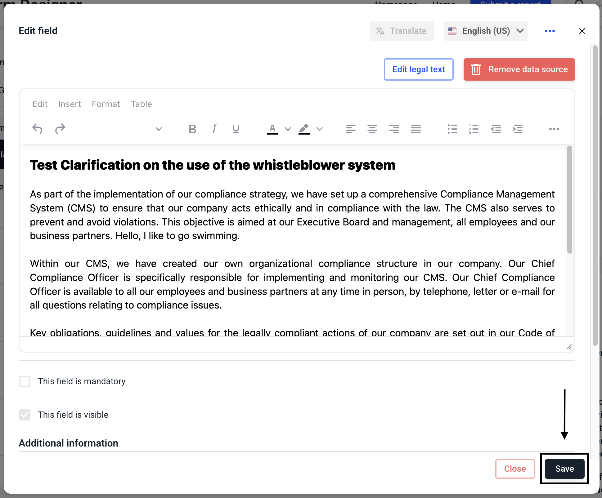 The data source has now been selected. Click on Save to add the legal text to the form.